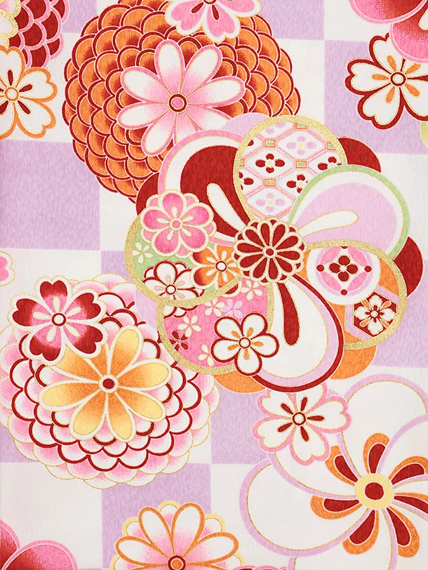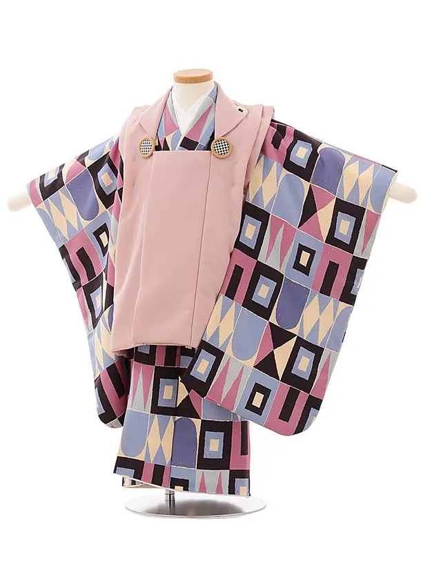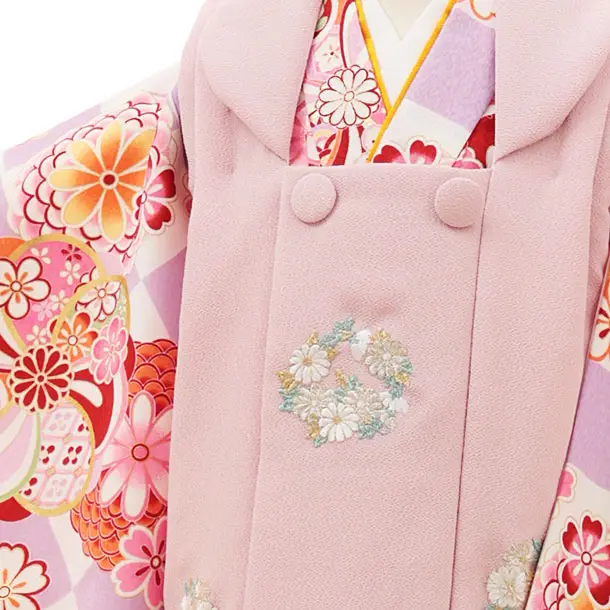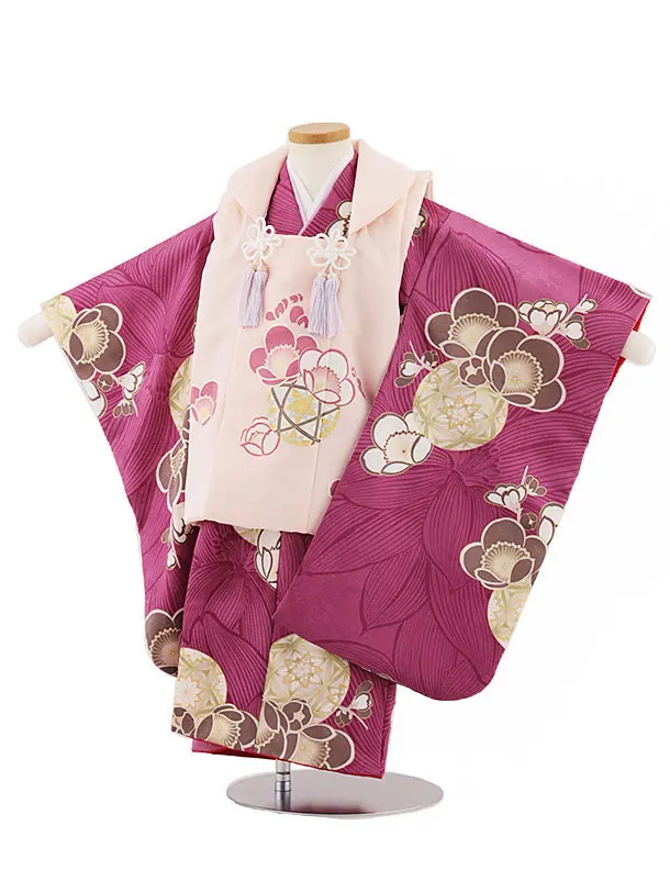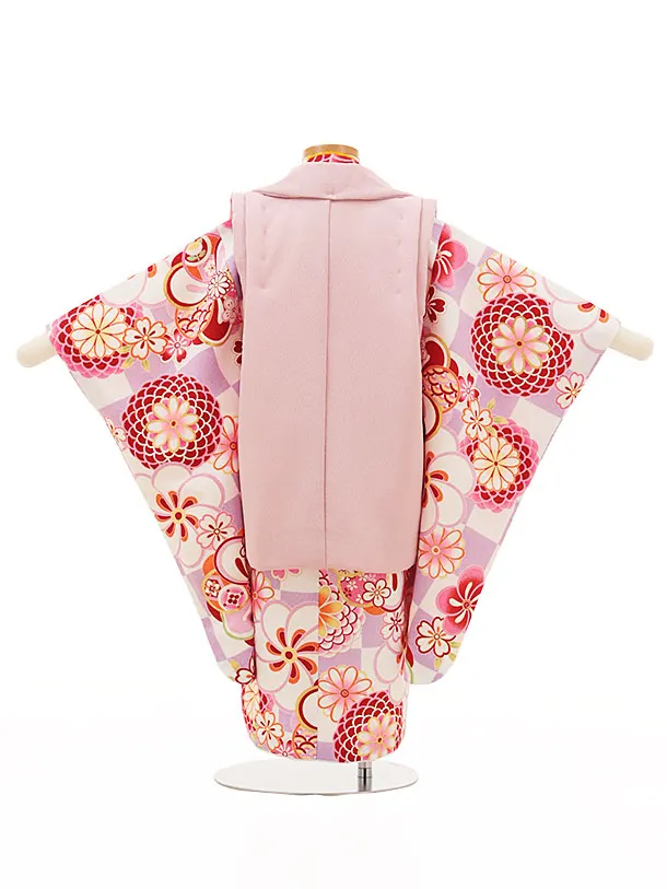 七五三レンタル(3歳女児被布)4454ピンク刺繍花丸xパープル市松花
