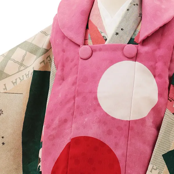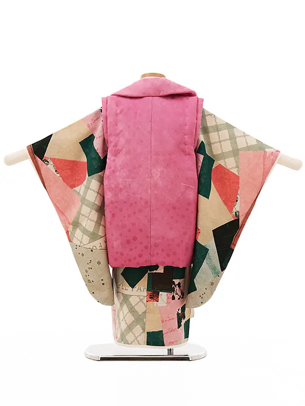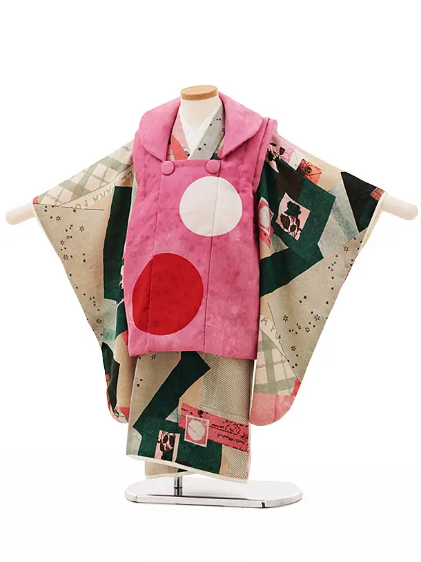 七五三レンタル(3歳女児被布)4494モダンアンテナピンクダメージxグリーン星間