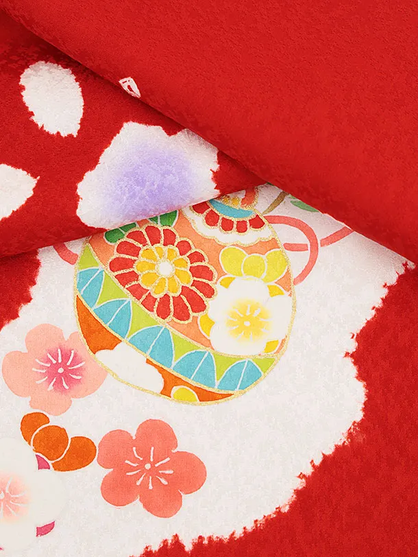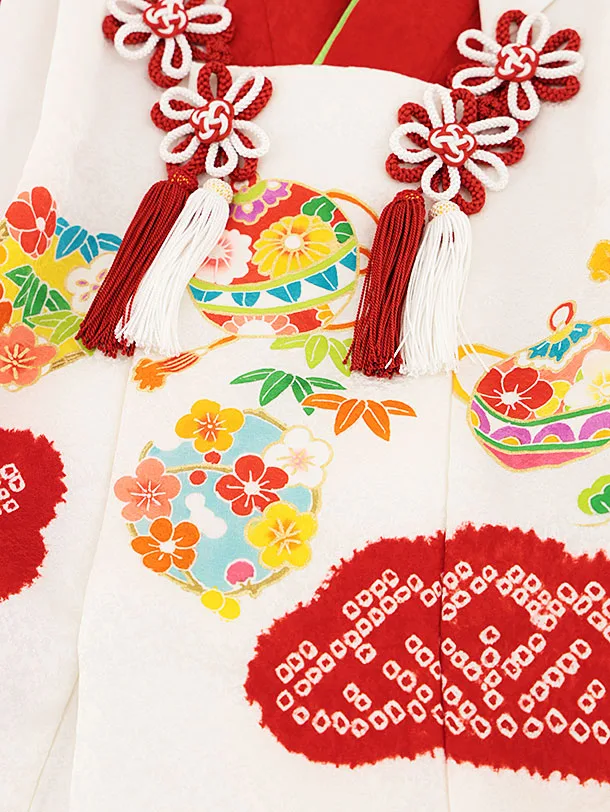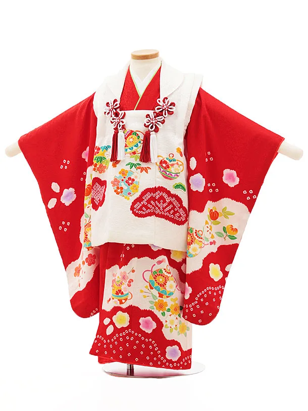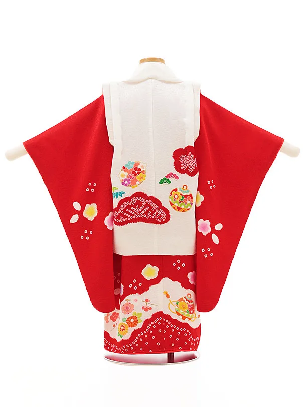 七五三レンタル(3歳女児被布)4526【正絹】白×赤鈴に梅桜橘