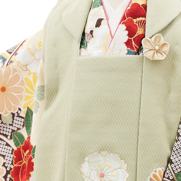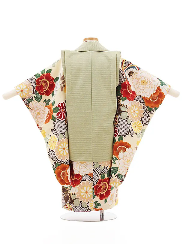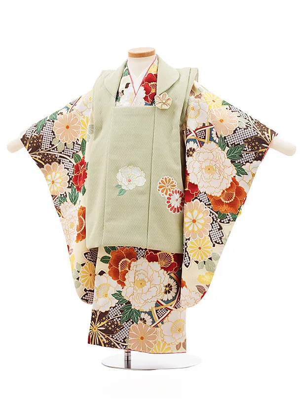 七五三(3歳女児)4532 花わらべくすみグリーン刺繍花×クリーム花