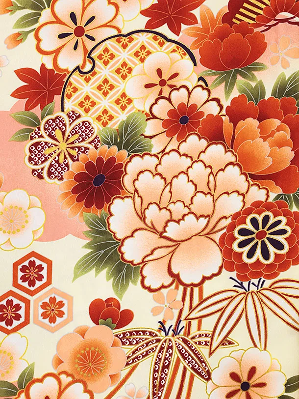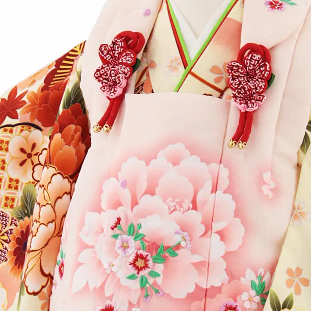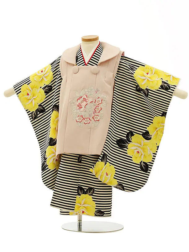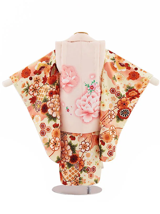 七五三レンタル(3歳女児被布)4558 ピンク花刺繍×クリームイエロー牡丹