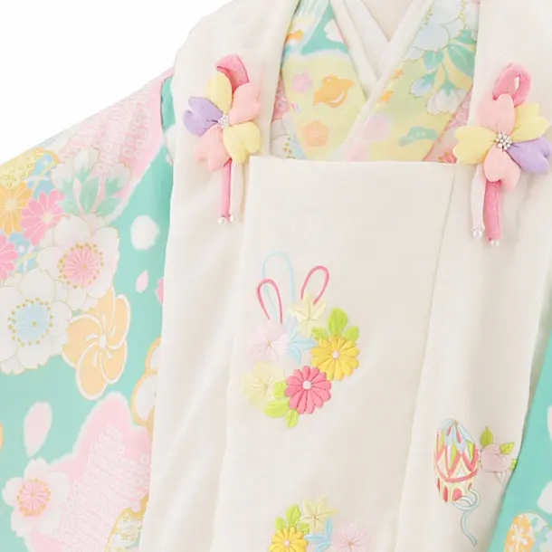 七五三(3歳女児被布)4562 アイボリー花刺繍×パステルグリーンまりと花