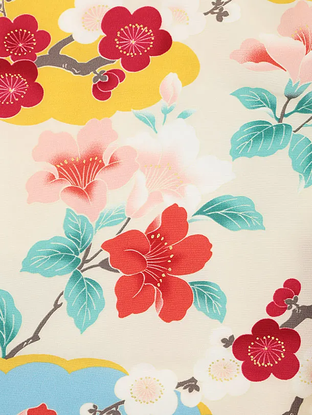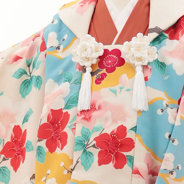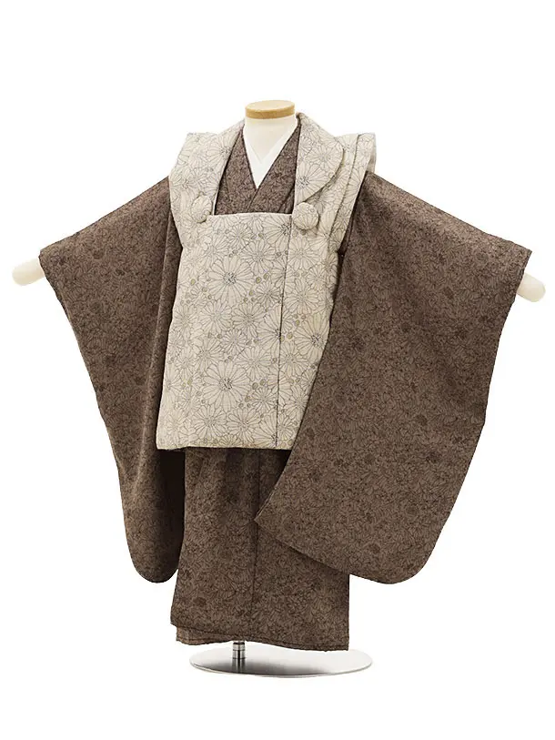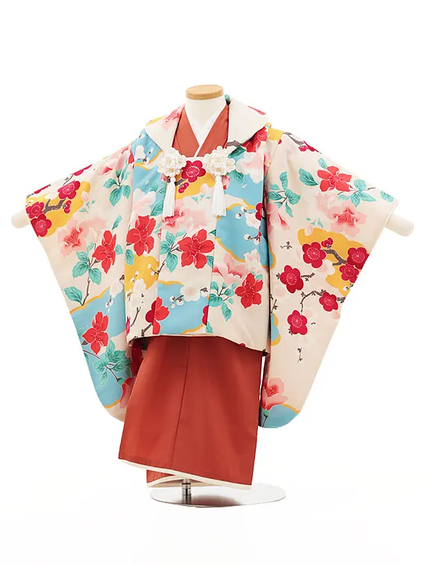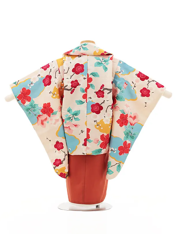七五三レンタル(3歳女児被布)4623 袖付きベージュ水色雲取り梅花×茶