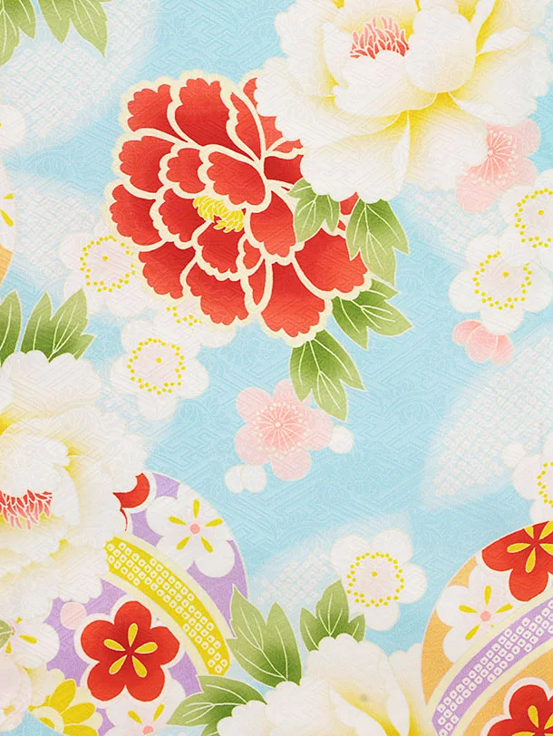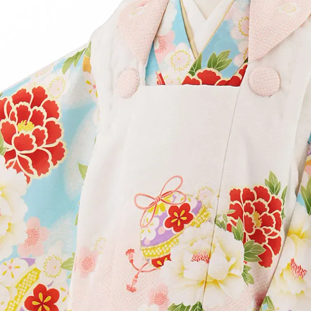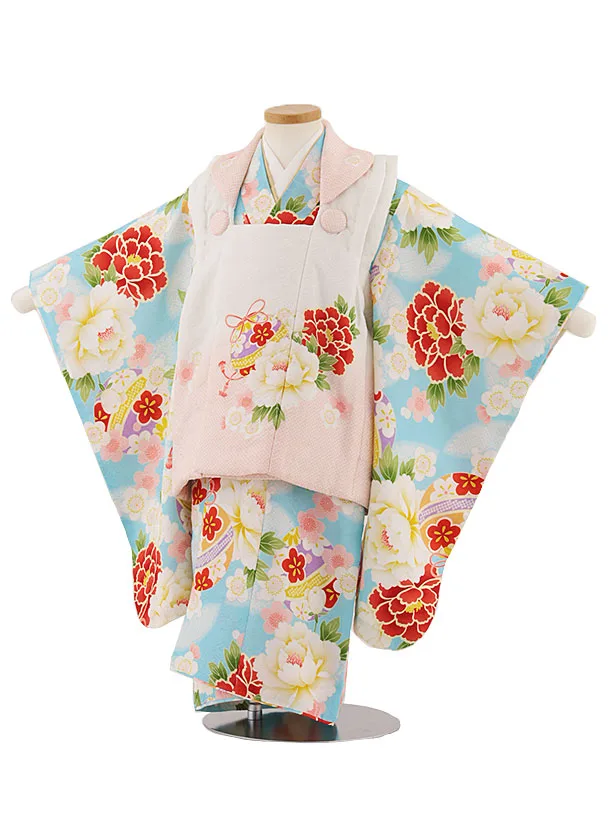 七五三レンタル(3歳女児被布)4642【正絹】白地ぼかし×水色牡丹に鞠