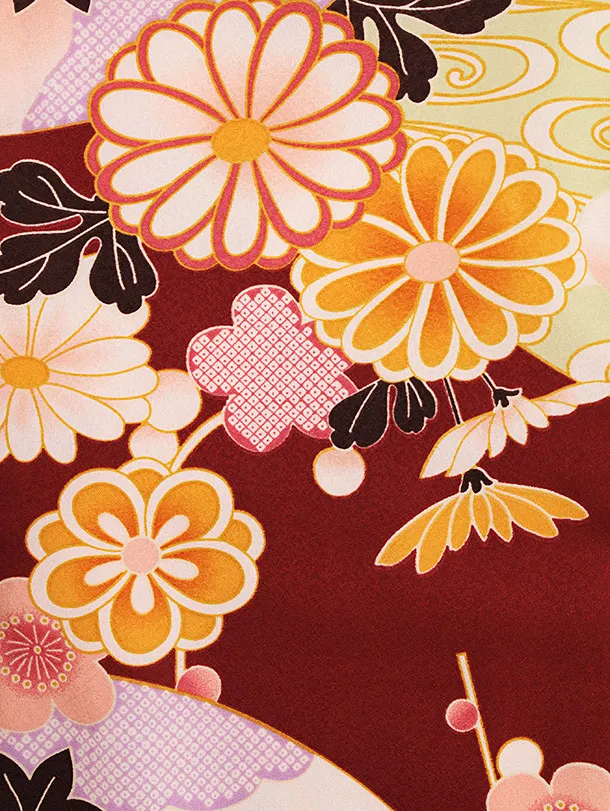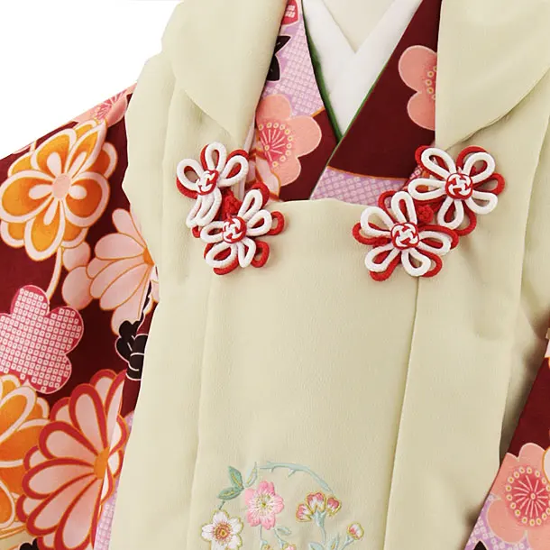 七五三レンタル(3歳女児被布)4678 ベージュ刺繍桜×ボルドー扇面花柄