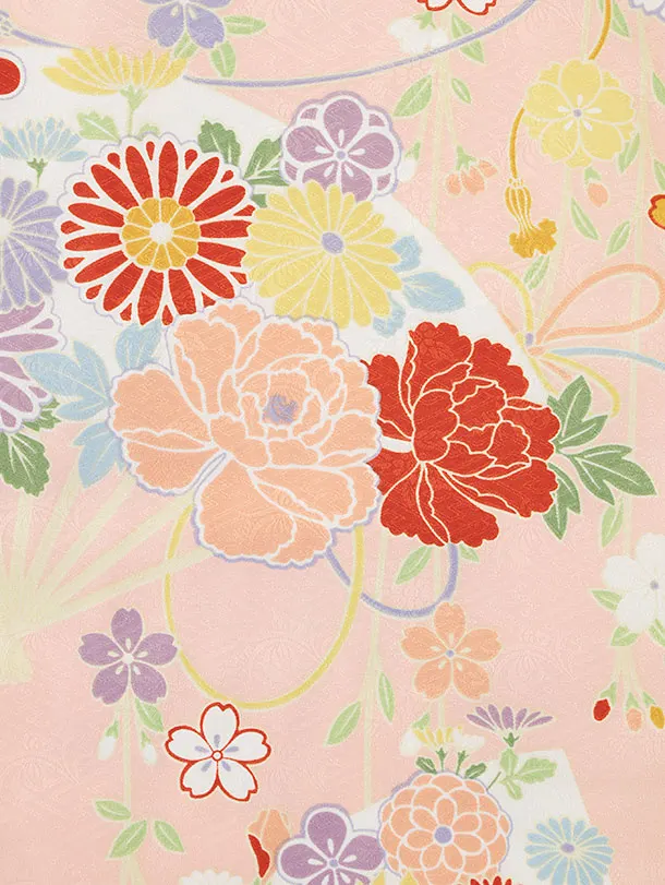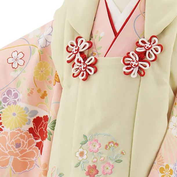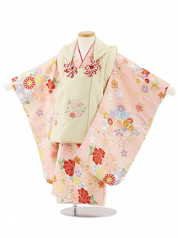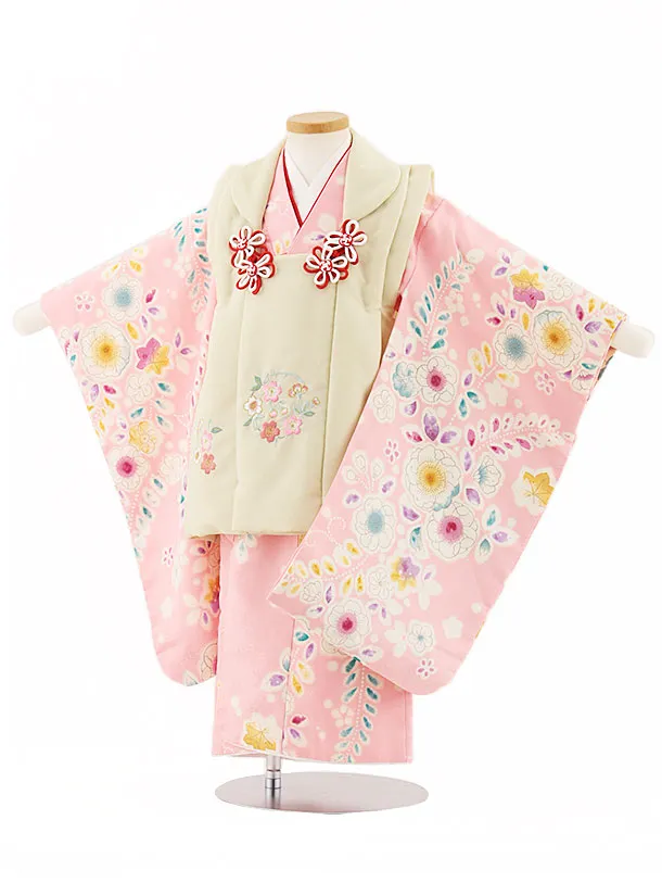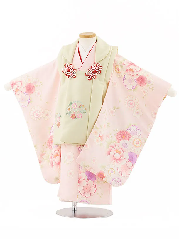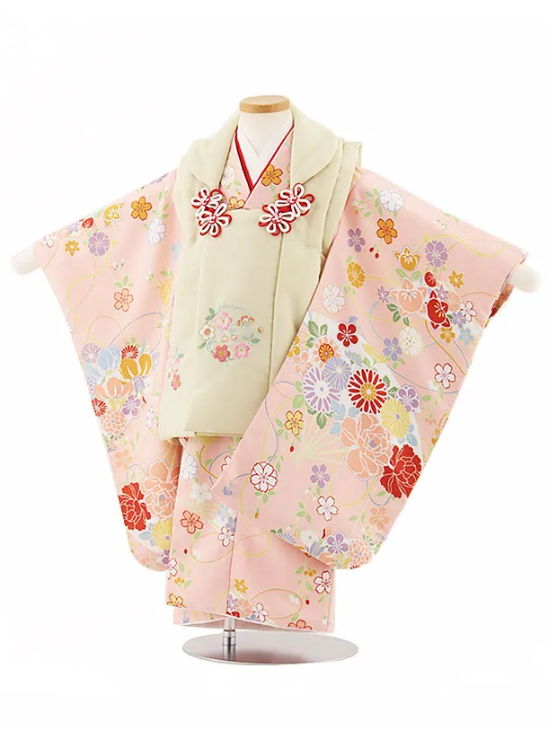 七五三レンタル(3歳女児被布)4684 ベージュ刺繍桜×ピンク扇と古典華