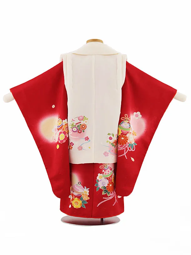 七五三レンタル(3歳女児被布)4690【高級正絹】白×赤 牡丹鈴