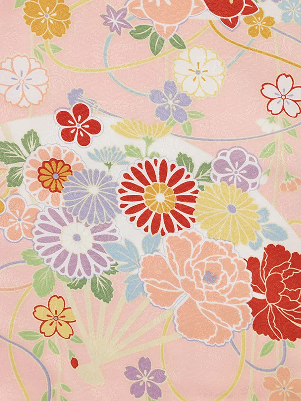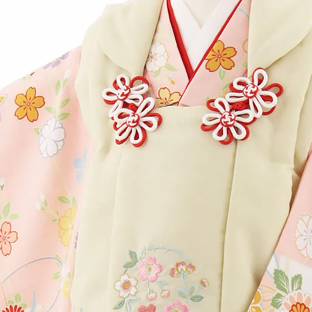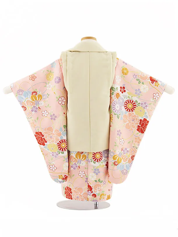 七五三(3歳女児被布)4734 ベージュ刺繍桜×ピンク扇と古典花