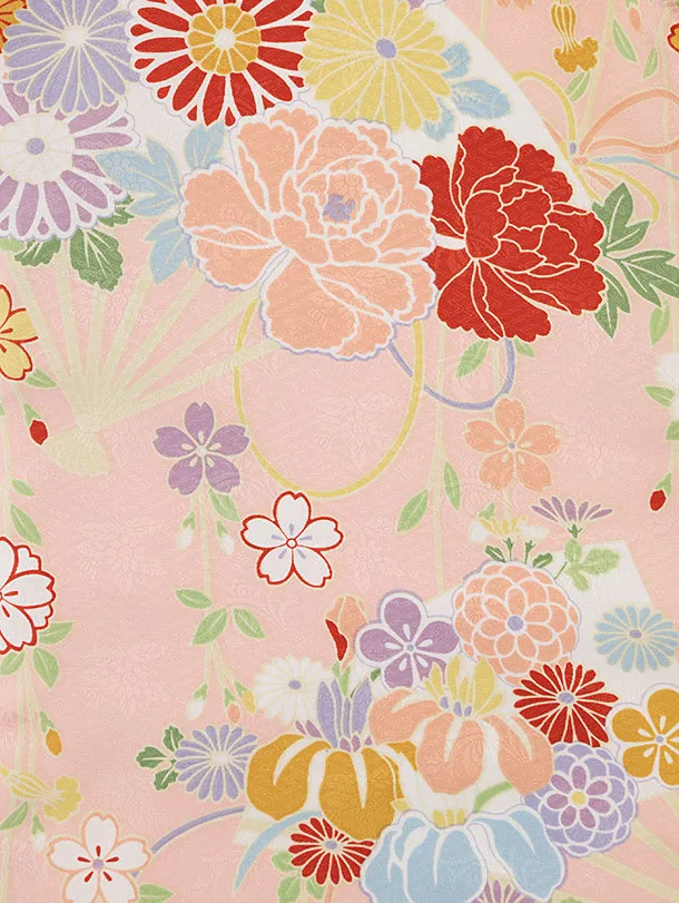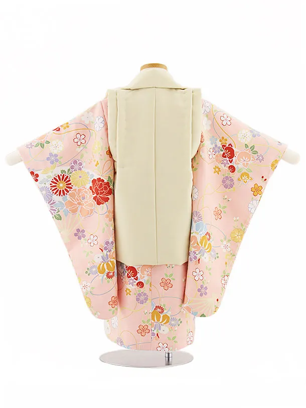 七五三(3歳女児被布)4735 ベージュ刺繍桜×ピンク扇と古典花
