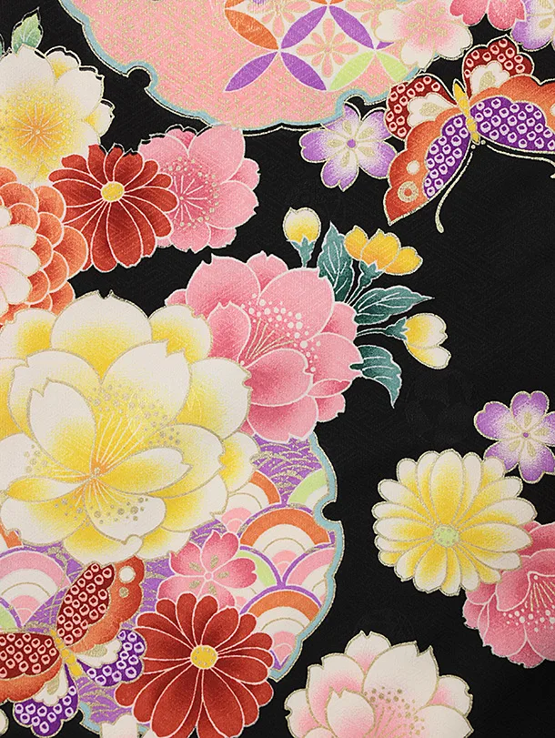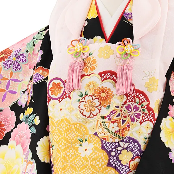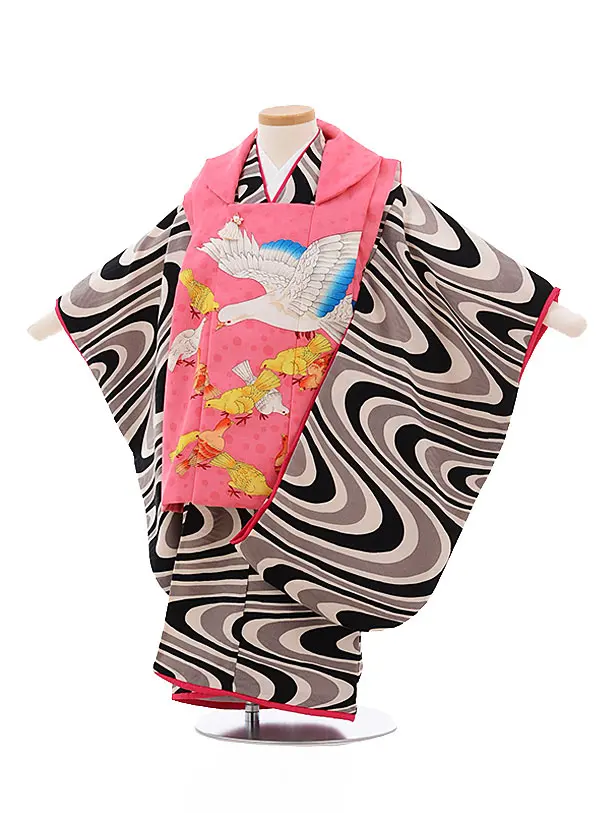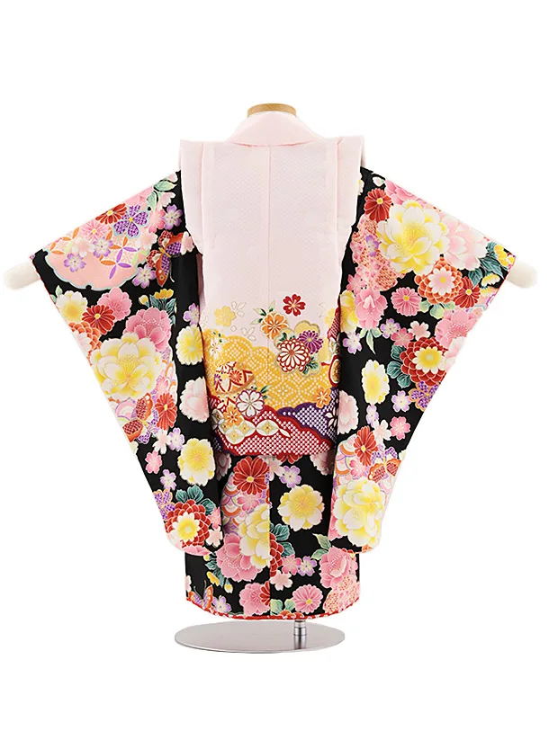 七五三レンタル(3歳女児被布)4827 ピンク雲取り鞠×黒地花蝶