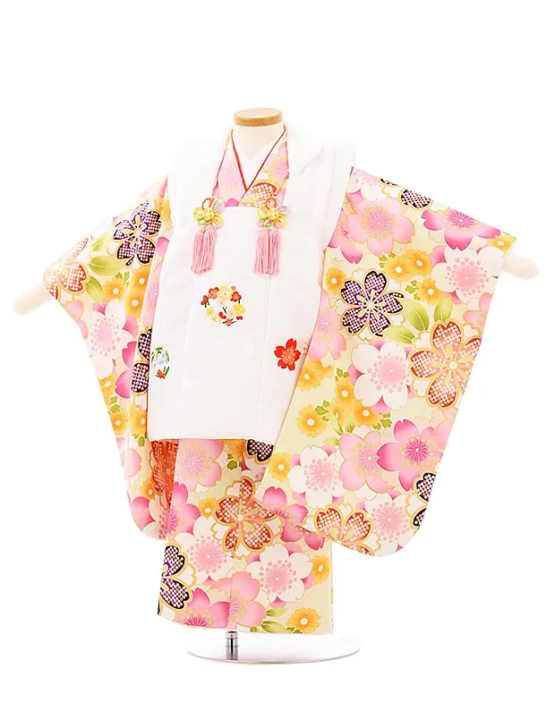 七五三レンタル(3歳女児被布)4864 白刺繍花丸×黄緑 扇と古典花