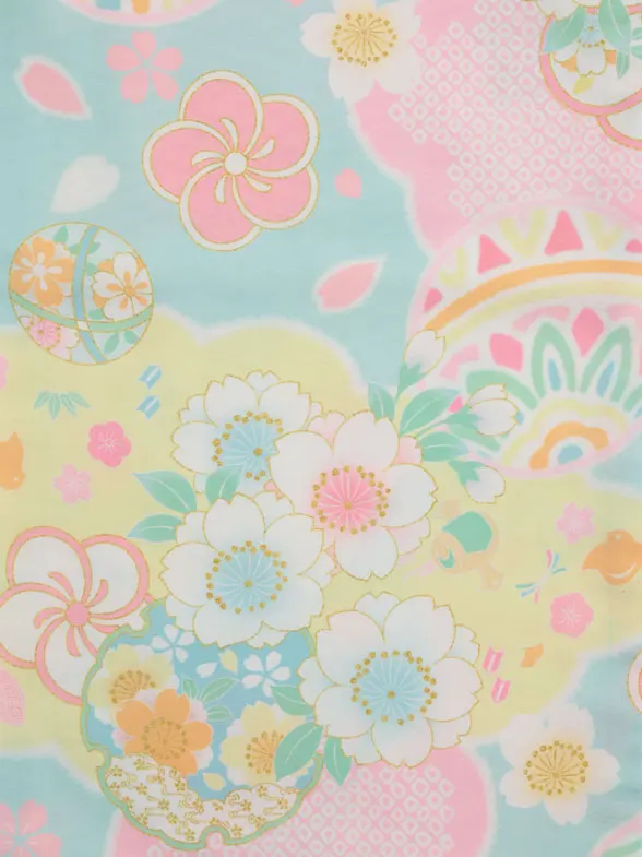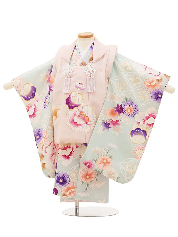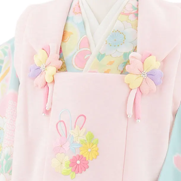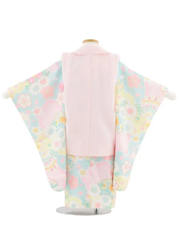 七五三レンタル(3歳女児被布)4950 ピンク花刺繍×パステルブルー 鞠と花
