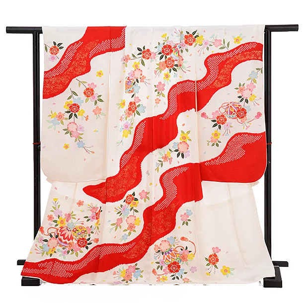 七五三レンタル(7歳女の子袋帯)7182 白地に赤 桜まり(正絹)
