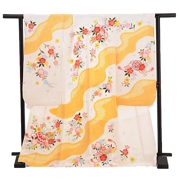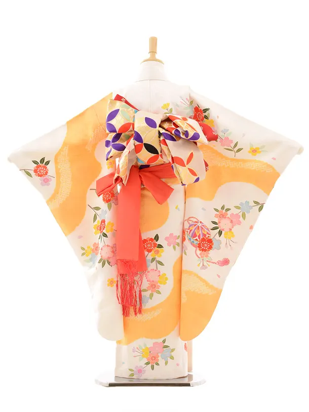 七五三レンタル(7歳女の子袋帯)7183 白地に黄色 桜まり(正絹)