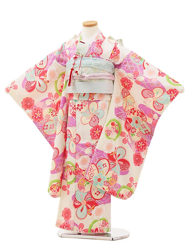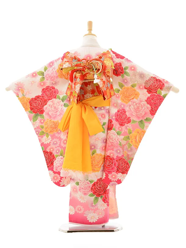 七五三レンタル(7歳女の子結び帯)7233 白地 ピンクバラ