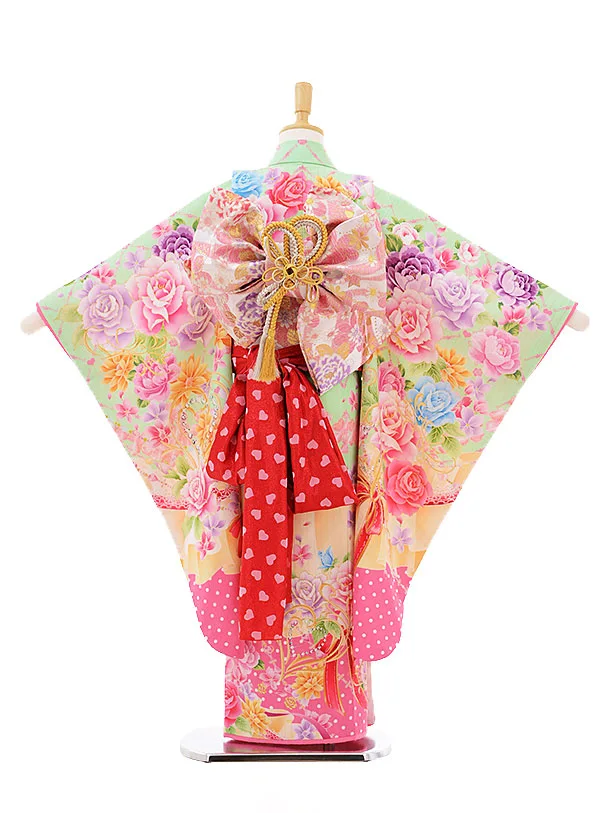 七五三レンタル(7歳女の子結び帯)7316 グリーン地 ハートリボンバラ