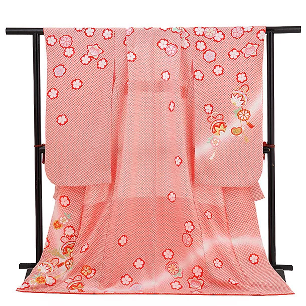 紅白の鹿の子に肩からあざやかな桜が舞うあでやかなお着物です。縁起のよいくす玉模様が可愛らしさを醸し出しています