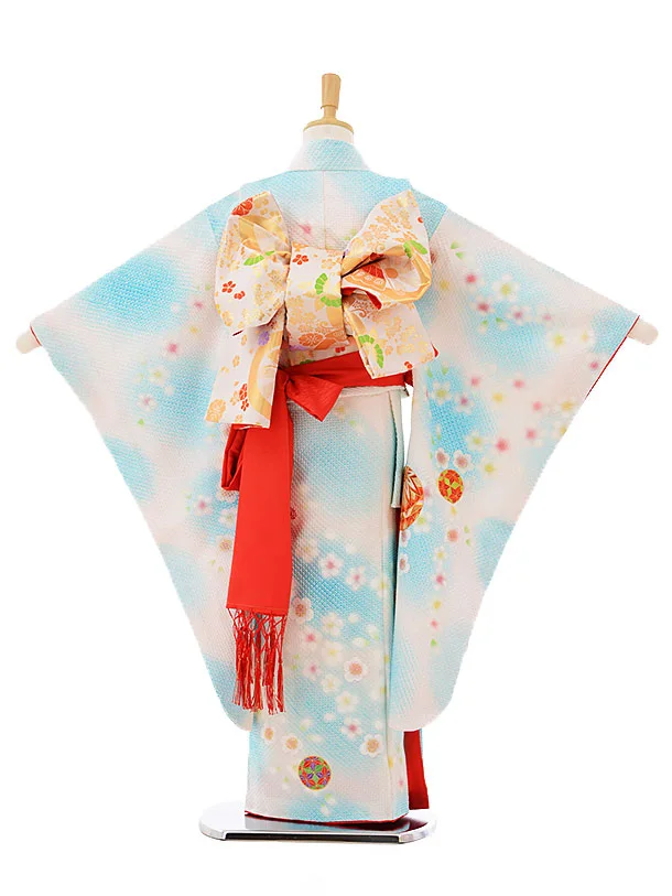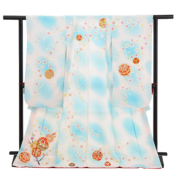 七五三レンタル(7歳女の子袋帯)7326 水色総絞り梅尽くしにまり (正絹)