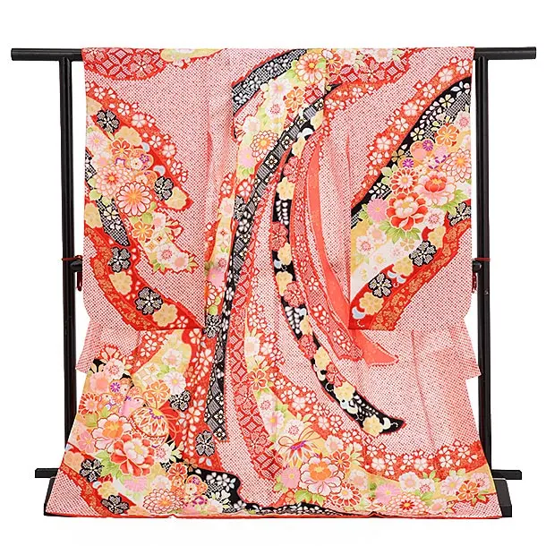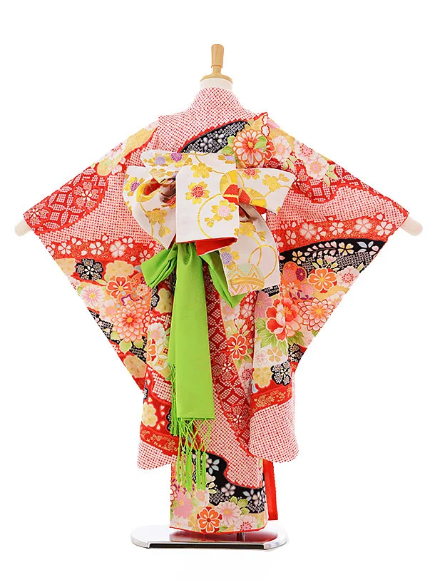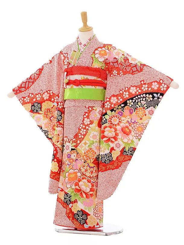七五三レンタル(7歳女の子袋帯)7329 赤 鹿の子 ぼたん まり (正絹)
