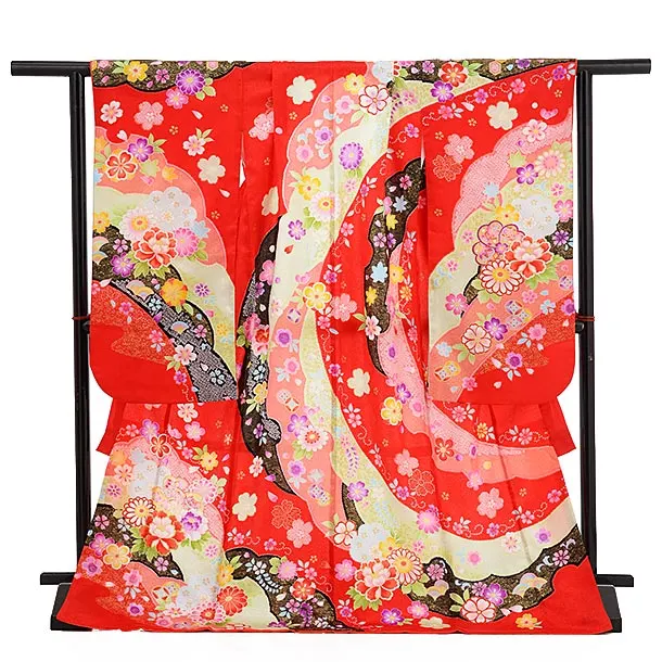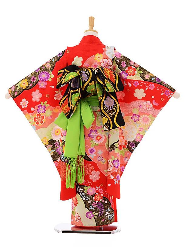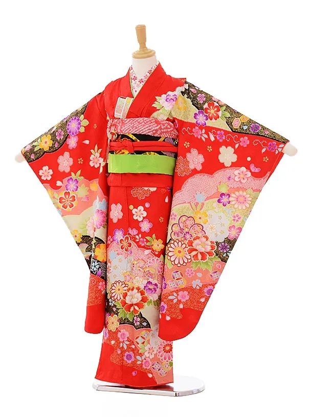 七五三レンタル(7歳女の子袋帯)7330 赤 ぼたん 菊 (正絹)