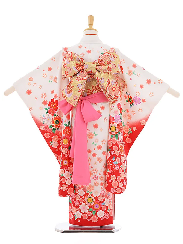 七五三レンタル(7歳女の子結び帯)7383 白地 裾赤 桜づくし