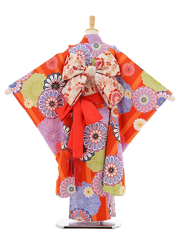七五三レンタル(7歳女の子結び帯)7429 朱赤地 縞菊