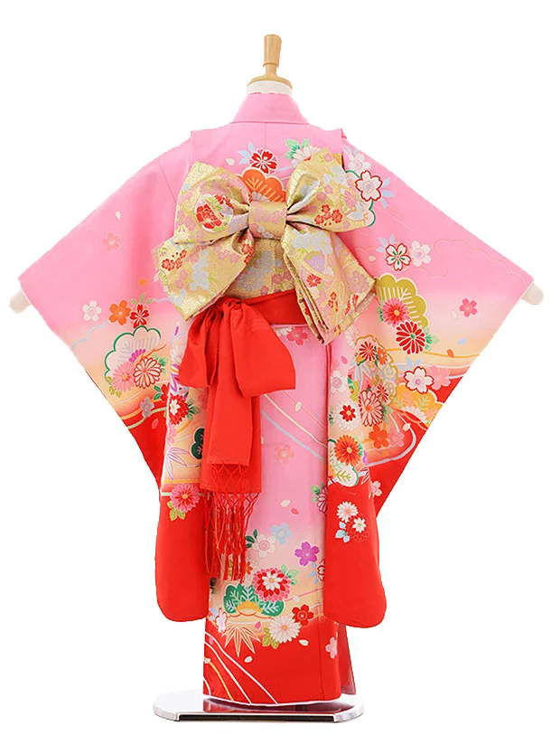 七五三レンタル(7歳女の子結び帯)7440 ピンク地 裾赤 雪輪に花