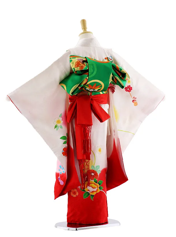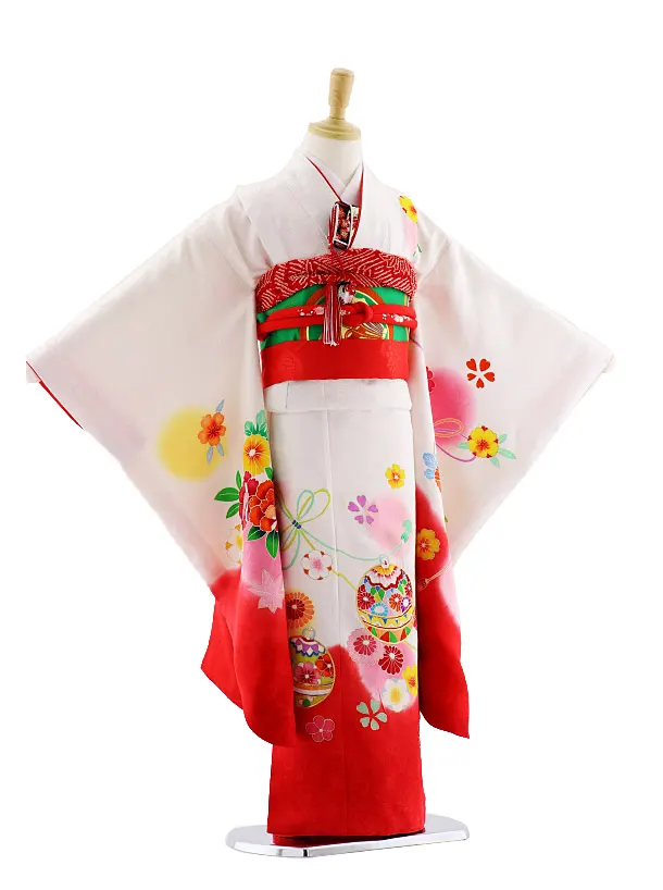 七五三レンタル(7歳女の子袋帯)7568 白地 裾赤 まり (正絹)