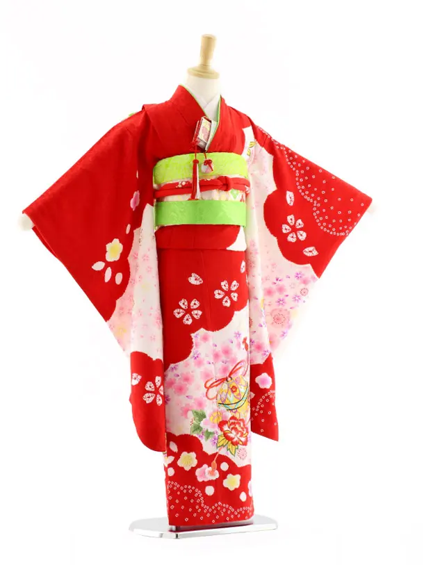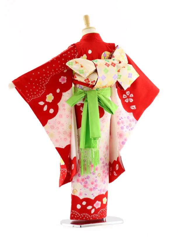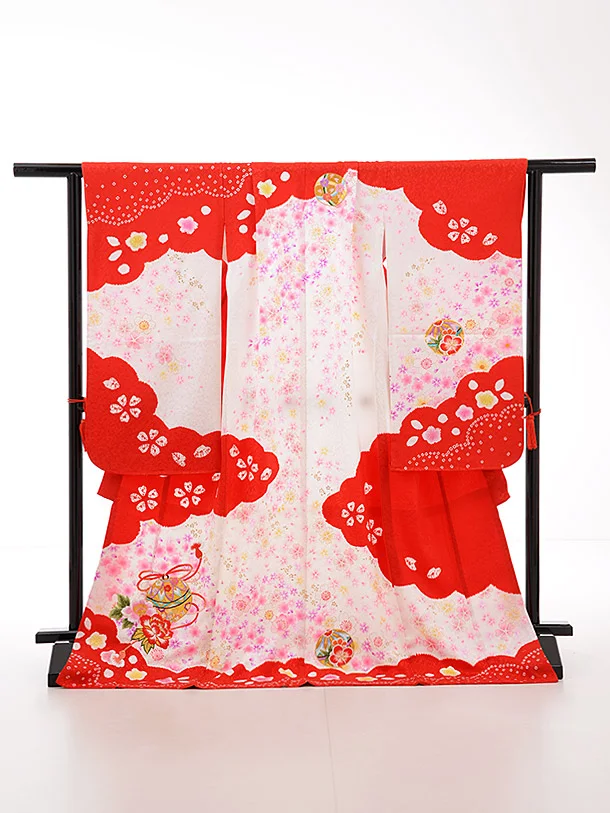 七五三レンタル(7歳女の子袋帯)7582 赤地 桜にまり (正絹)