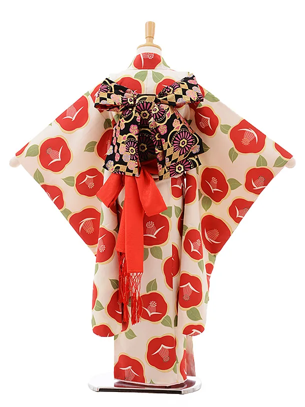 七五三(7歳女児結び帯)7671 クリーム地 椿 赤