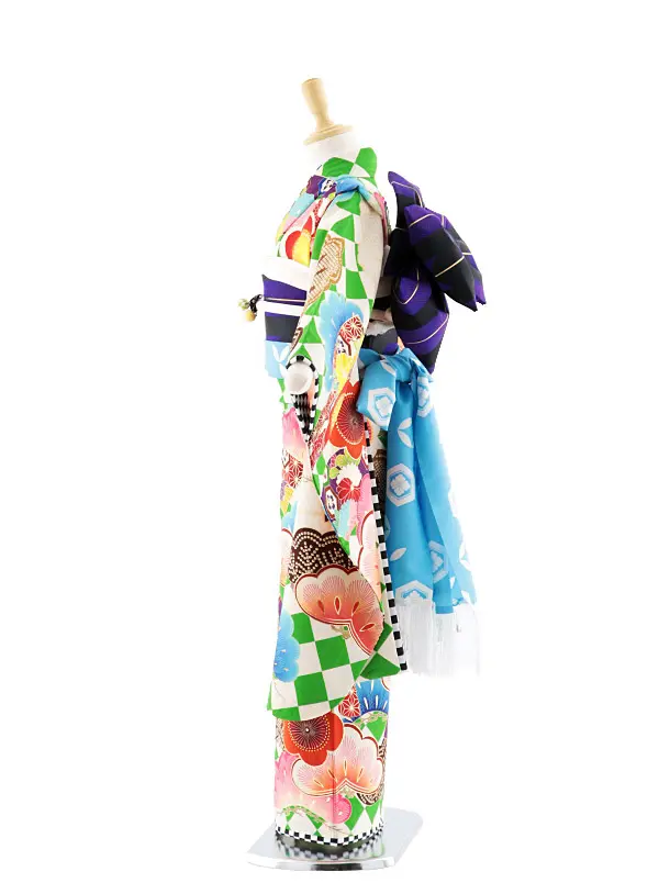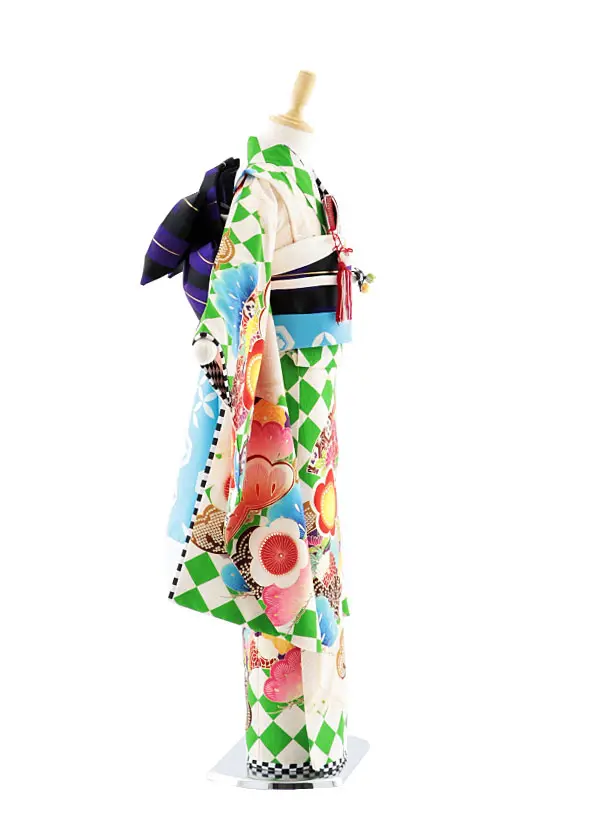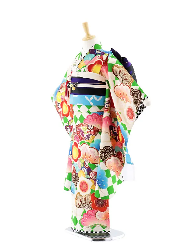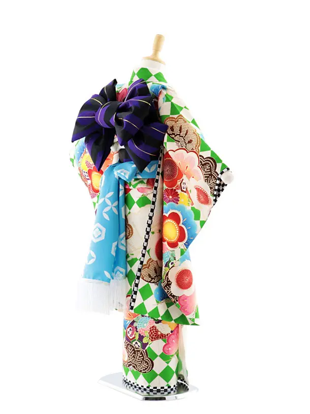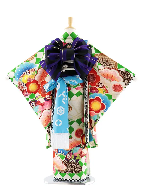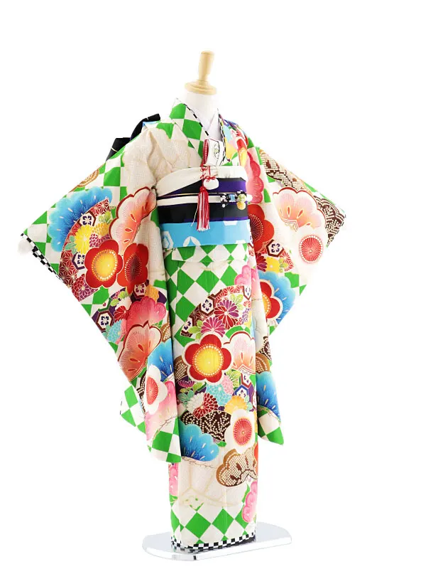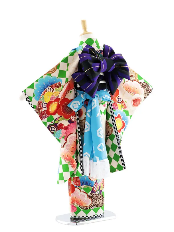 七五三(7歳女結帯)7706 JAPANSTYLE ダイヤに扇松梅 グリーン
