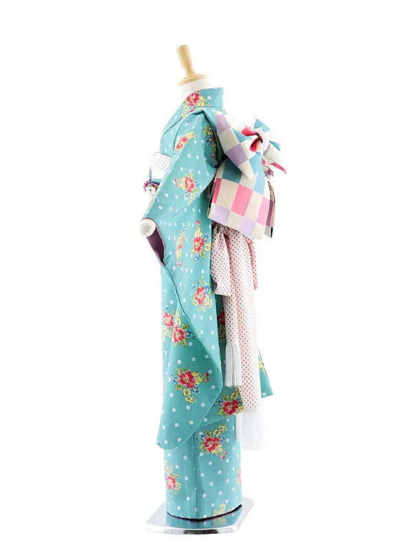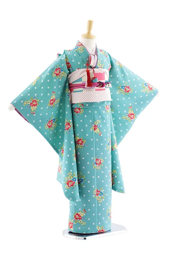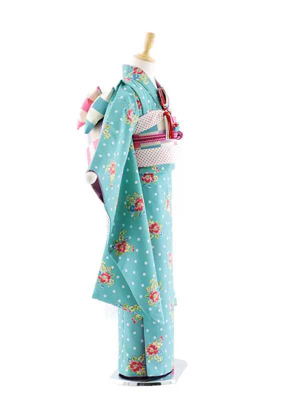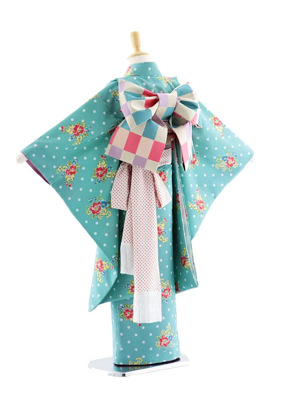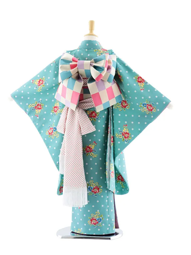 七五三(7歳女児結び帯)7711 ぷちぷり 水玉に花 グリーン