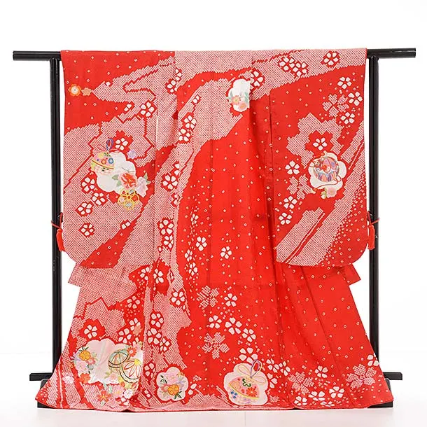 七五三レンタル(7歳女児結び帯)7713 正絹 赤地 菱田柄 雲取 まり 刺繍