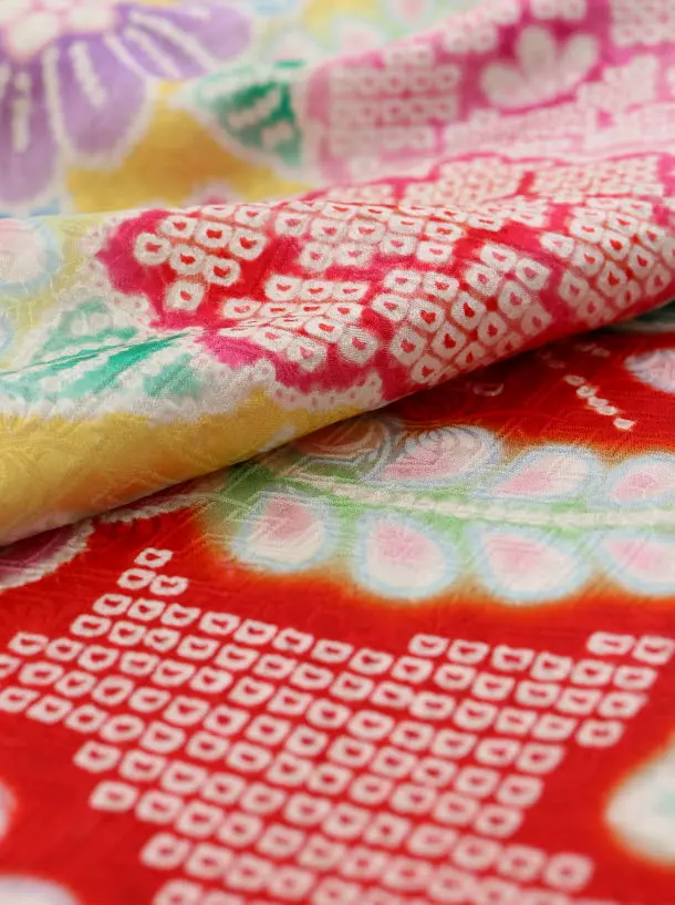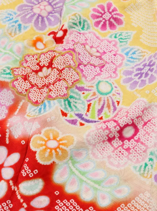 先染めした生地に柄を合わせて絞り加工を施した空絞り(からしぼり)という技法で作られた正絹の七五三着物です。やさしく可愛らしい色合いのお着物です。