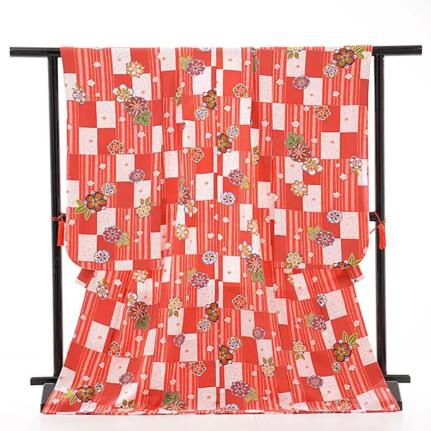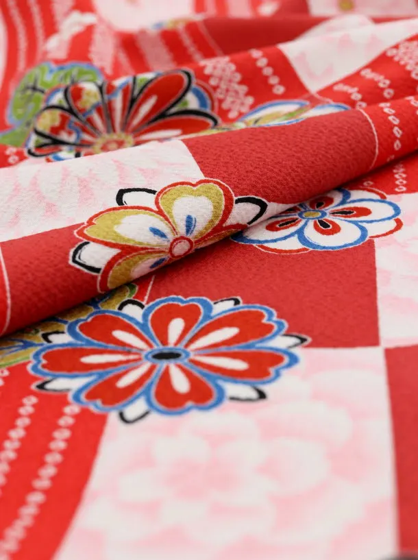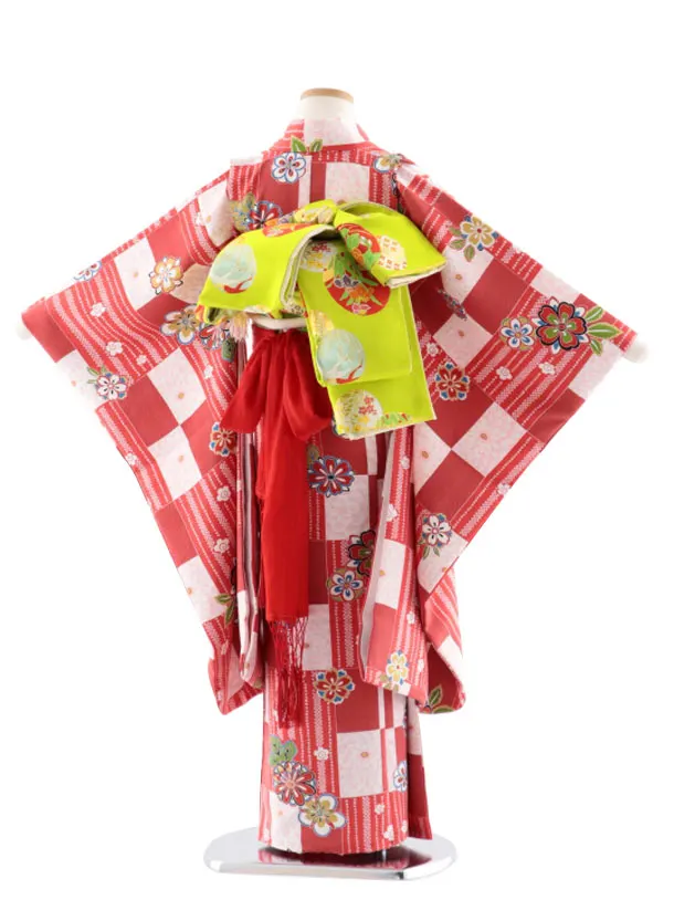 七五三レンタル(7歳女児袋帯) 正絹 7728 赤地 小紋 格子に桜