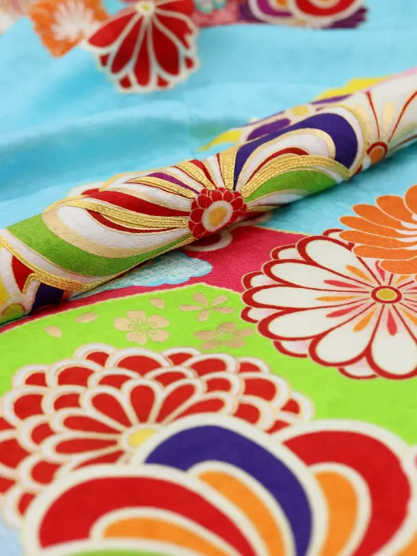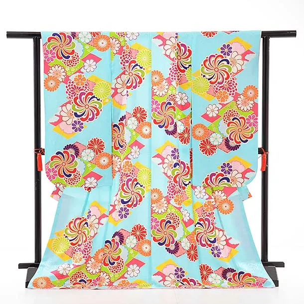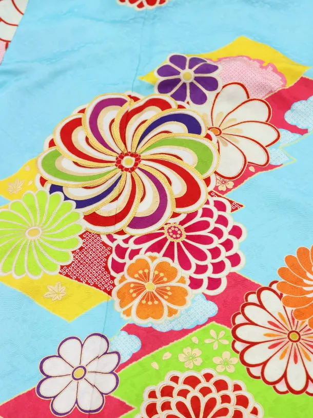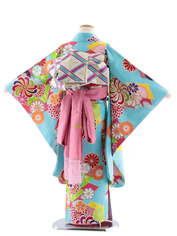 七五三レンタル(7歳女児袋帯) 高級正絹 7755 菱取りにねじり菊 水色
