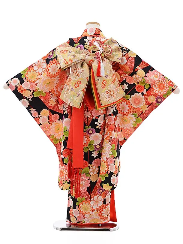 七五三(7歳女児結び帯)7798正絹黒地矢羽根に花