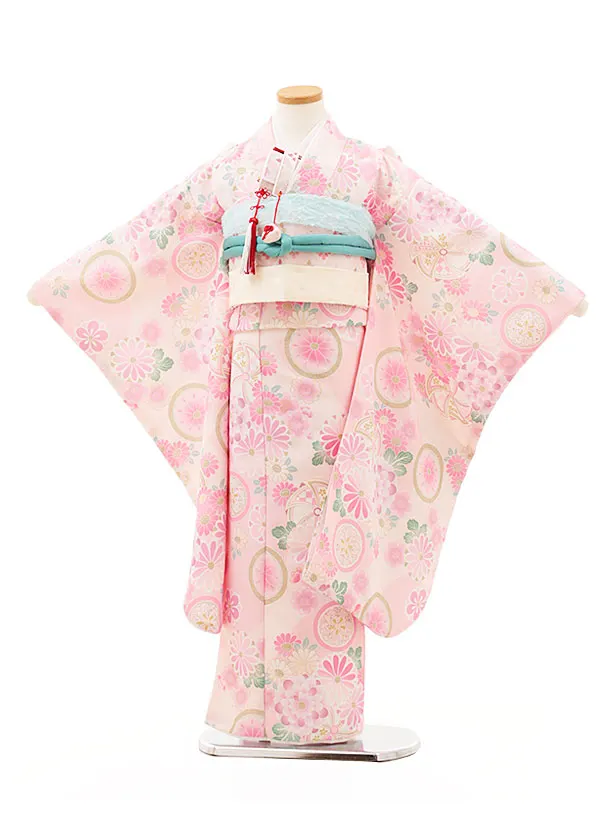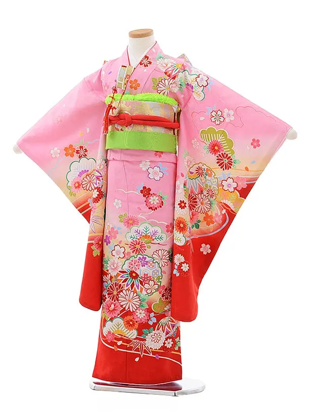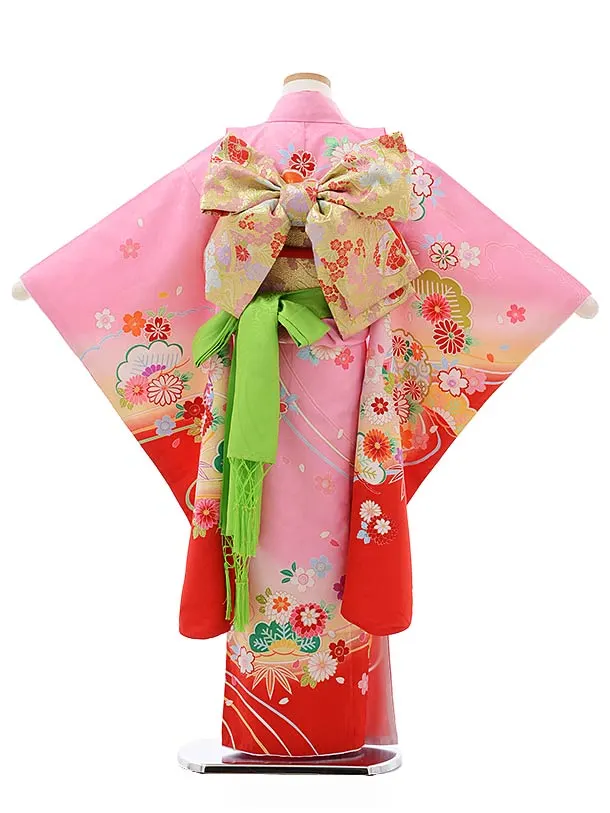 七五三レンタル(7歳女児結び帯)7802ピンク地裾赤雪輪に花
