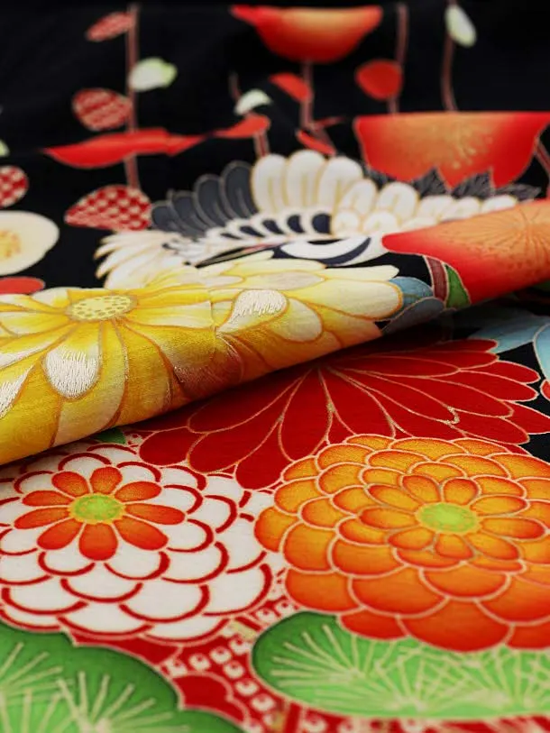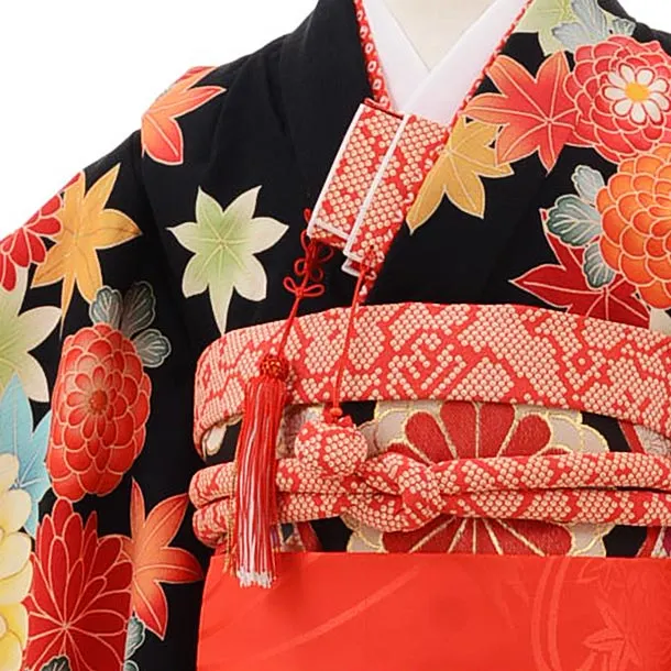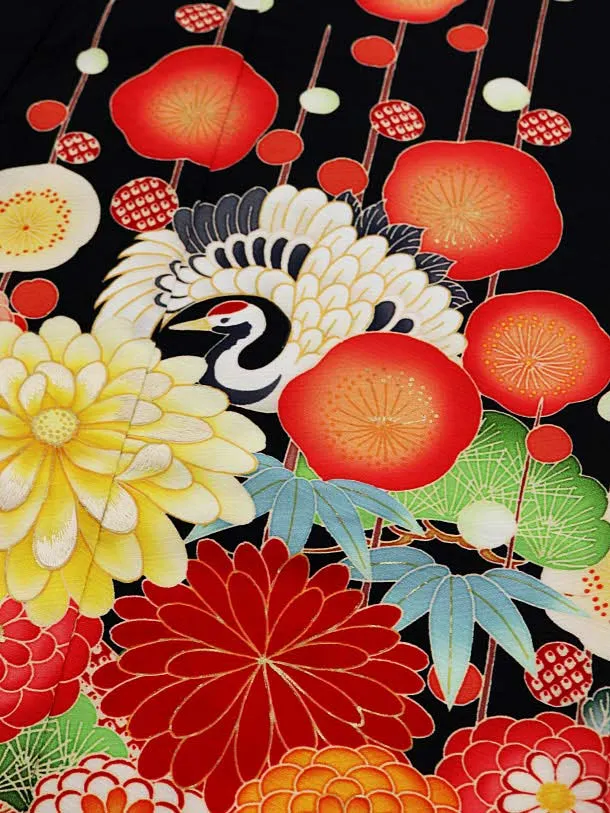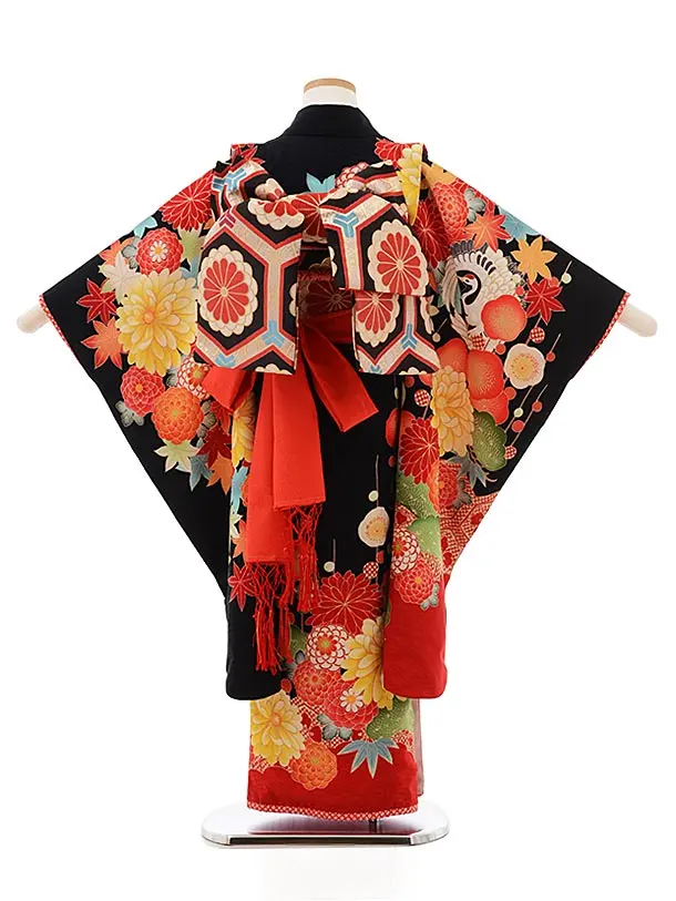 七五三レンタル(7歳女の子結び帯)7816黒地松菊鶴