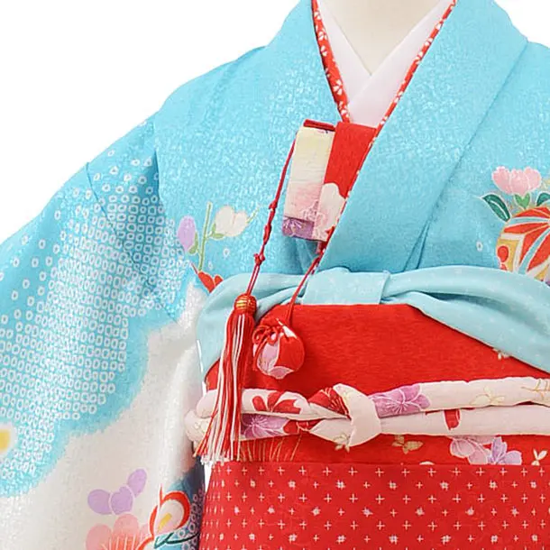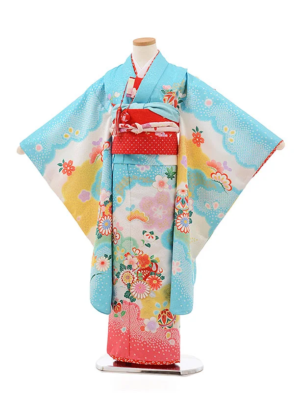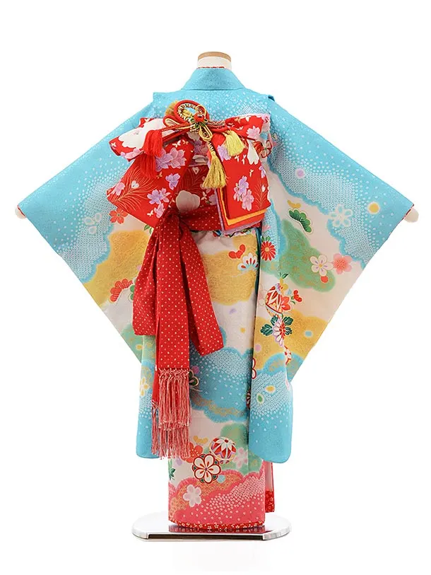 七五三レンタル(7歳女の子結び帯)7821水色地裾ピンク花まり