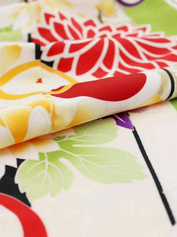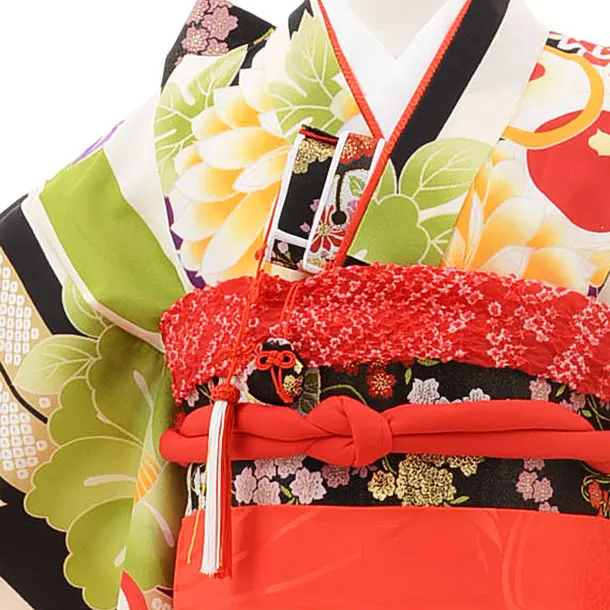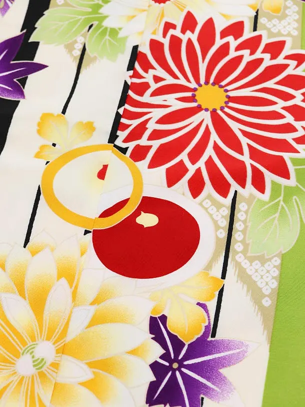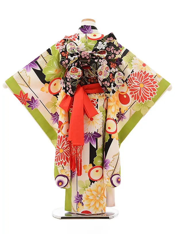 七五三レンタル(7歳女の子結び帯)7840 白グリーンストライプ菊椿