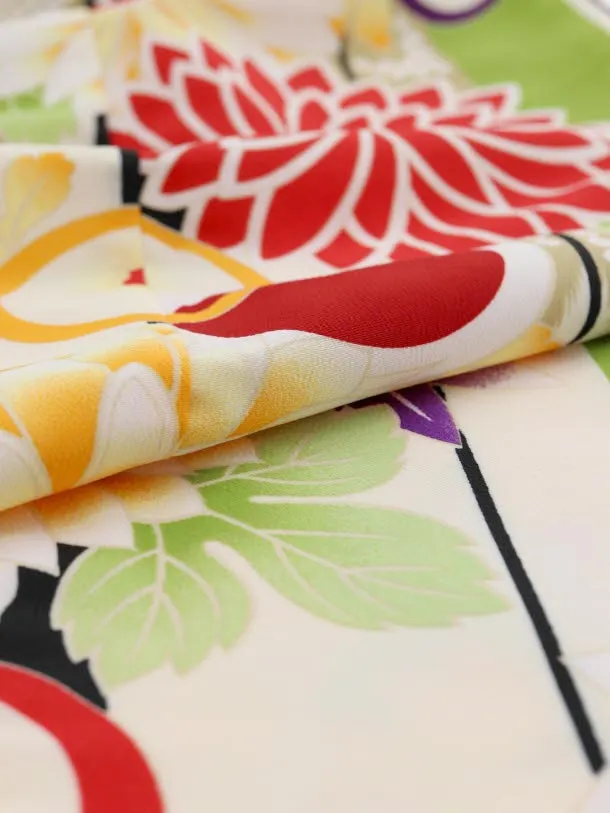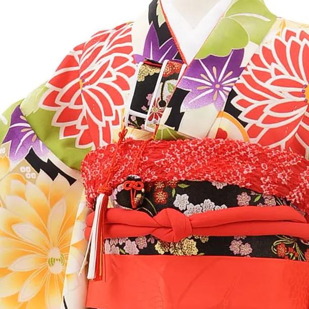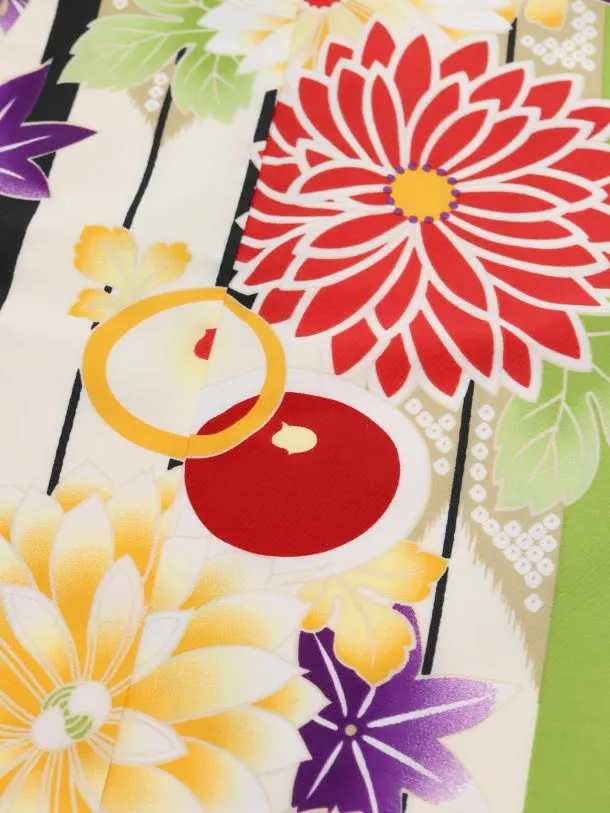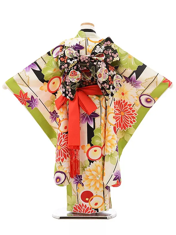 七五三レンタル(7歳女の子結び帯)7841 白グリーンストライプ菊椿