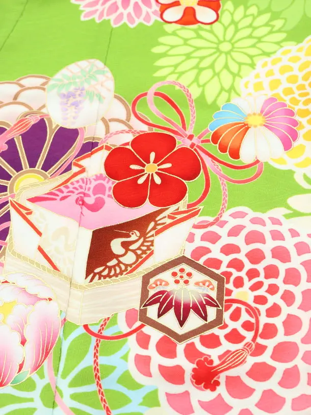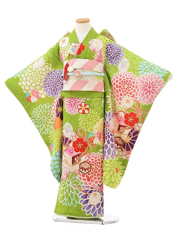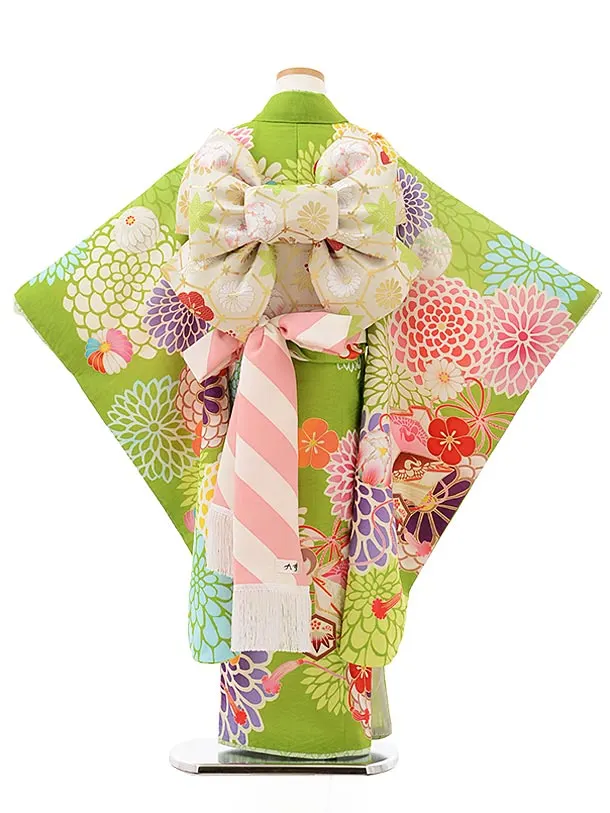 七五三レンタル(7歳女の子結び帯)7846 九重 グリーン地 絵羽菱餅