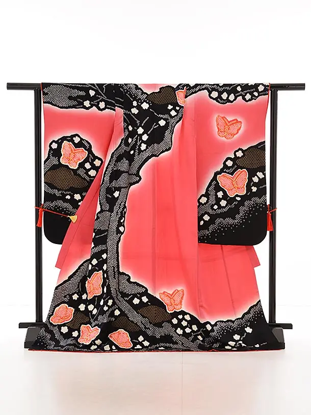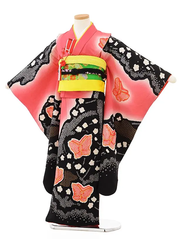 七五三レンタル(7歳女児袋帯) 7887 正絹 薄赤×黒 雲取りに蝶