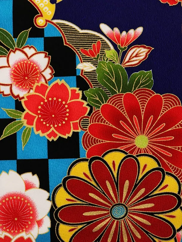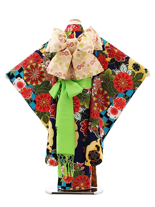 七五三レンタル(7歳女児結び帯)7932紺地雪輪菊ぼたん