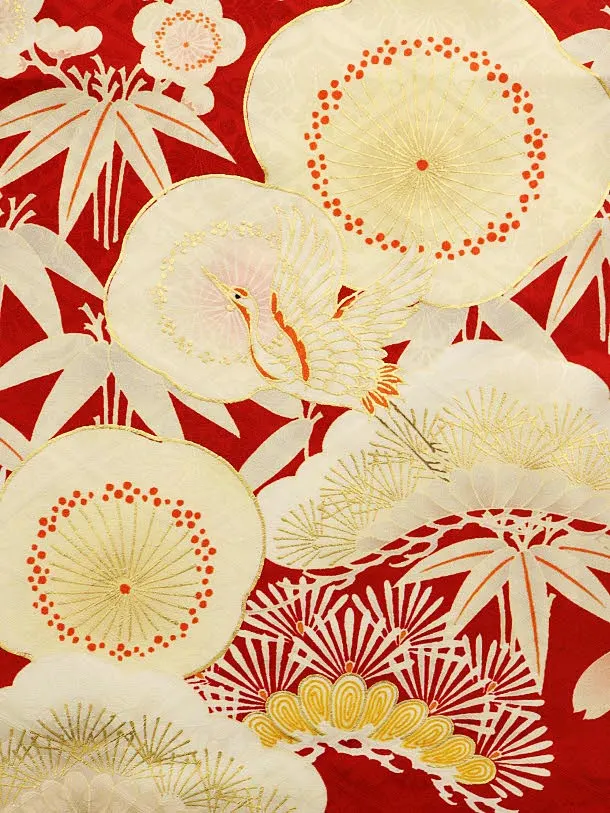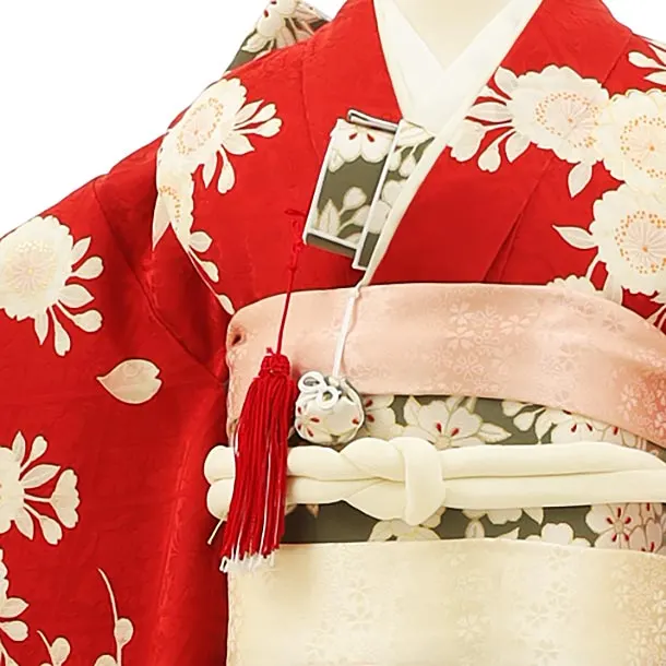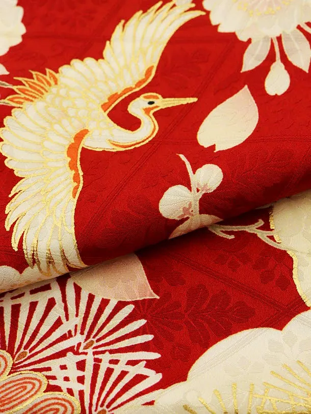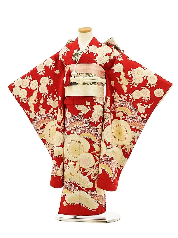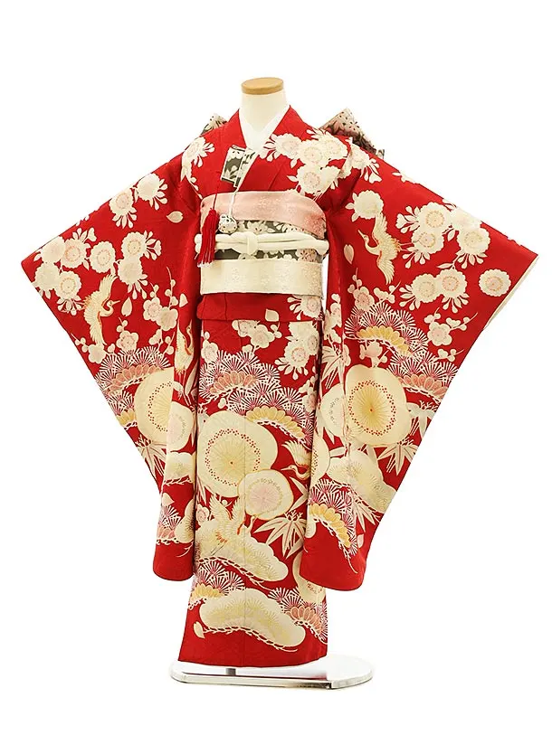 七五三(7歳女児結び帯) 高級正絹 7951 紅一点 絵羽赤地松竹梅に鶴