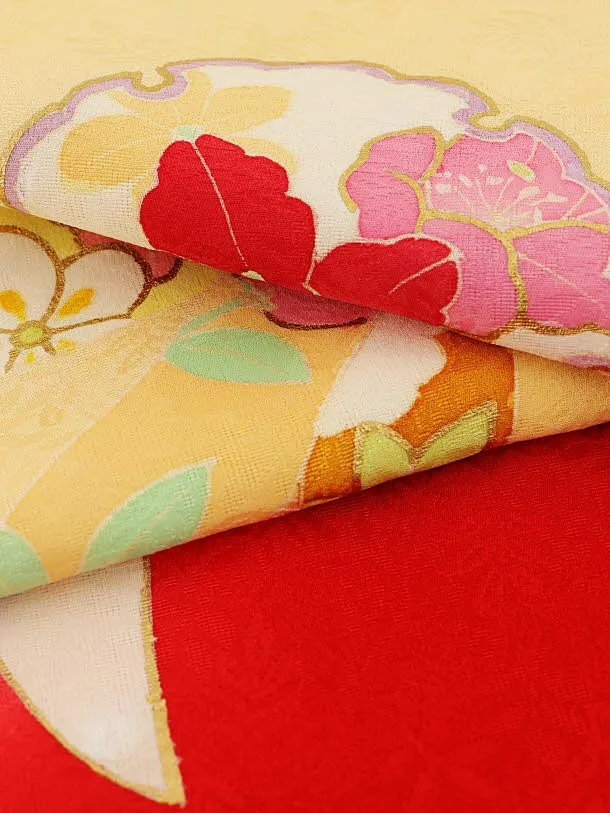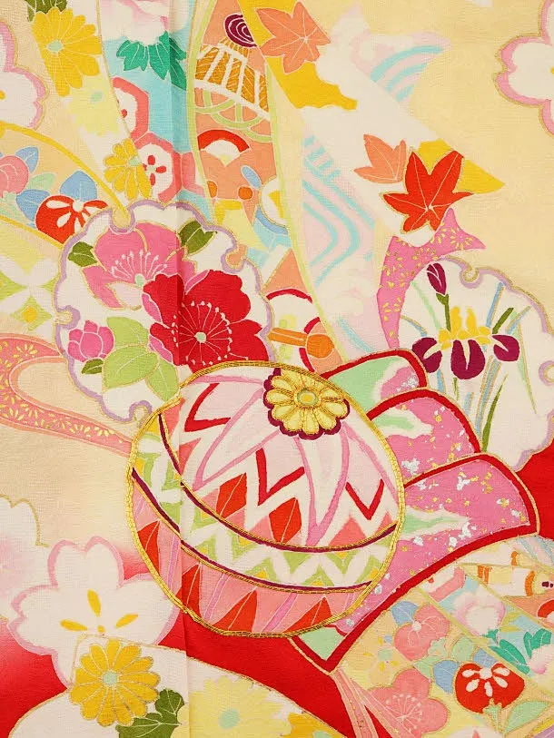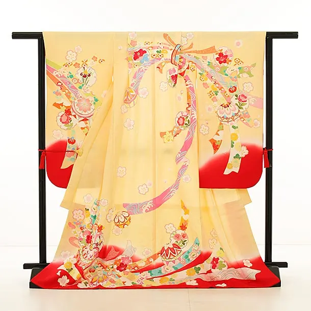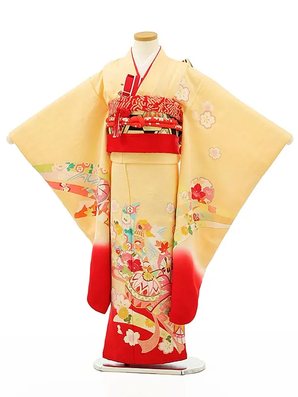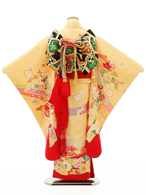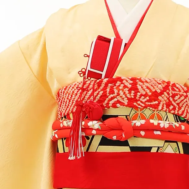 七五三(7歳女児結び帯) 高級正絹 7957 卵色 裾赤束ね熨斗にまり