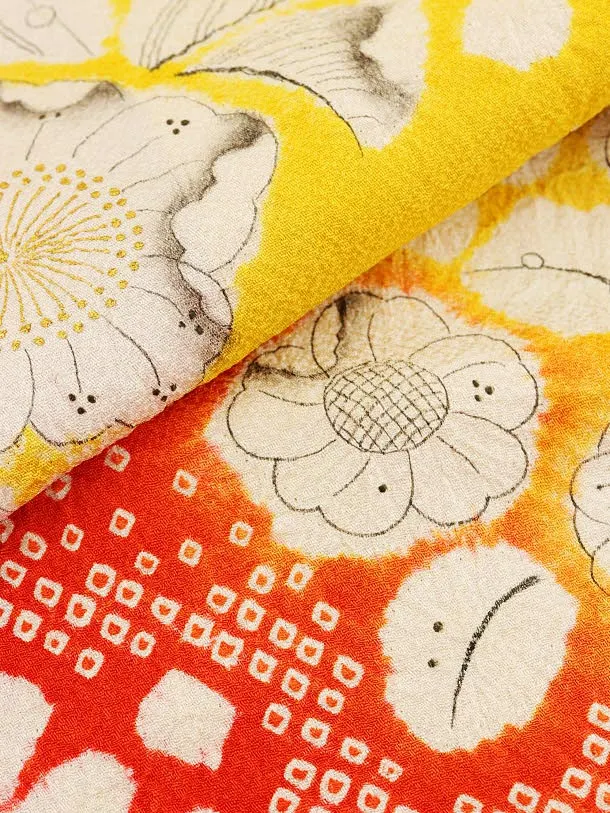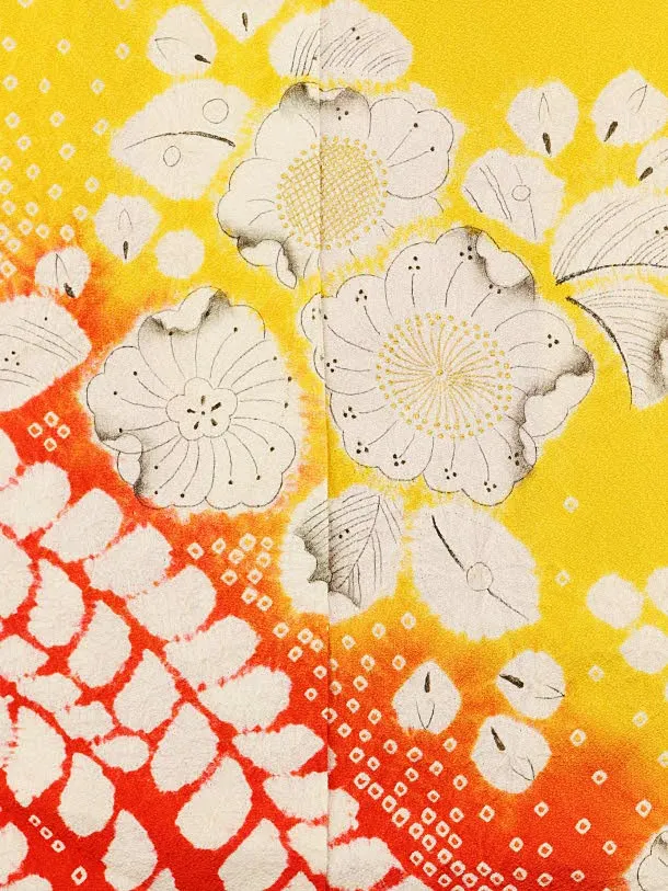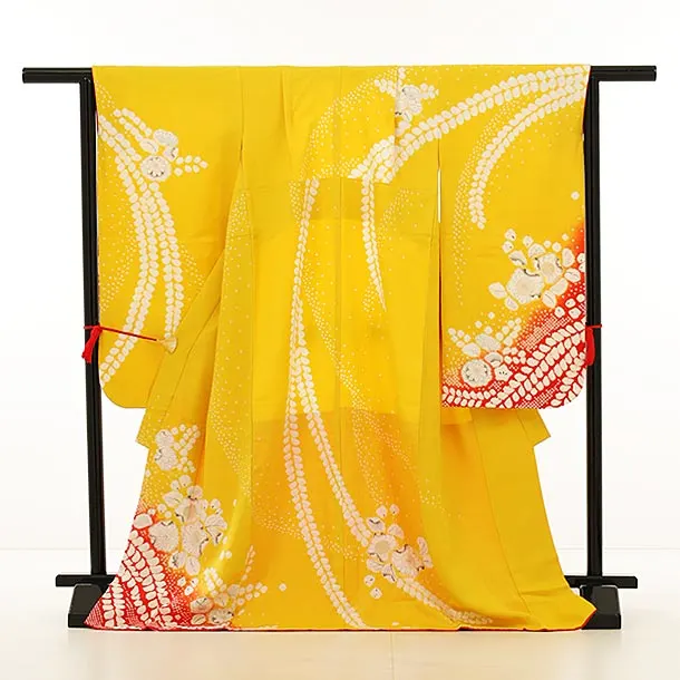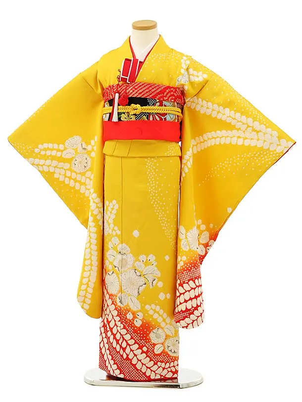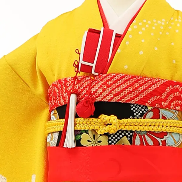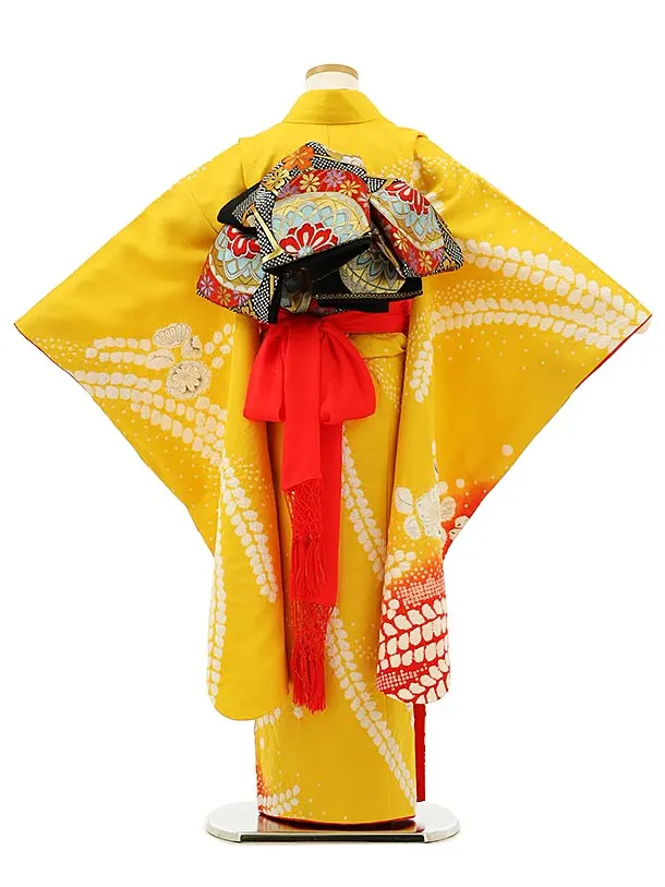 七五三レンタル(7歳女の子袋帯)7974(高級正絹) 黄色 裾赤 辻が花調