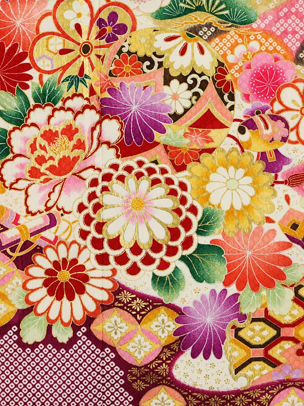 七五三レンタル(7歳女の子結び帯)7984 クリーム色 青海波 花づくし