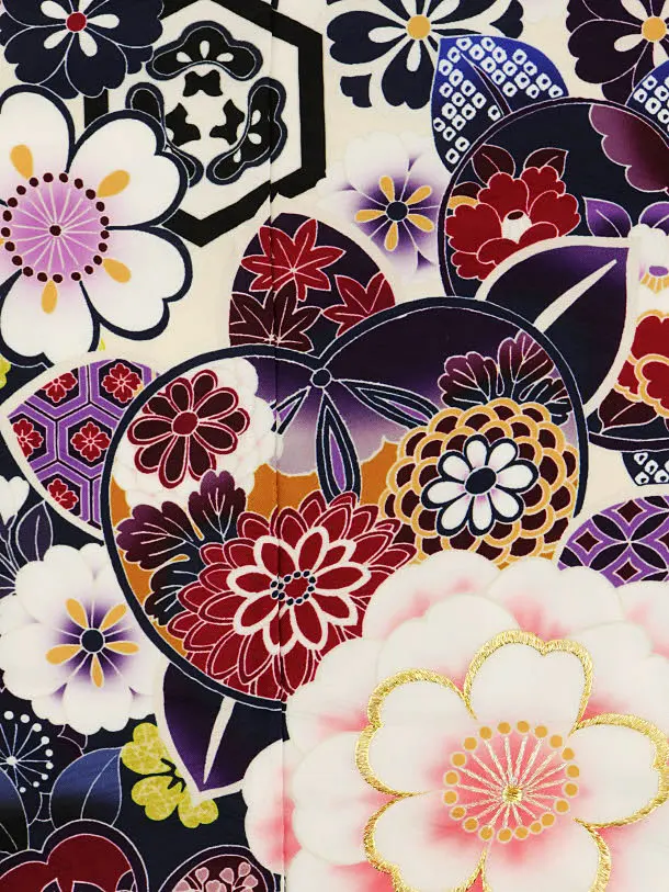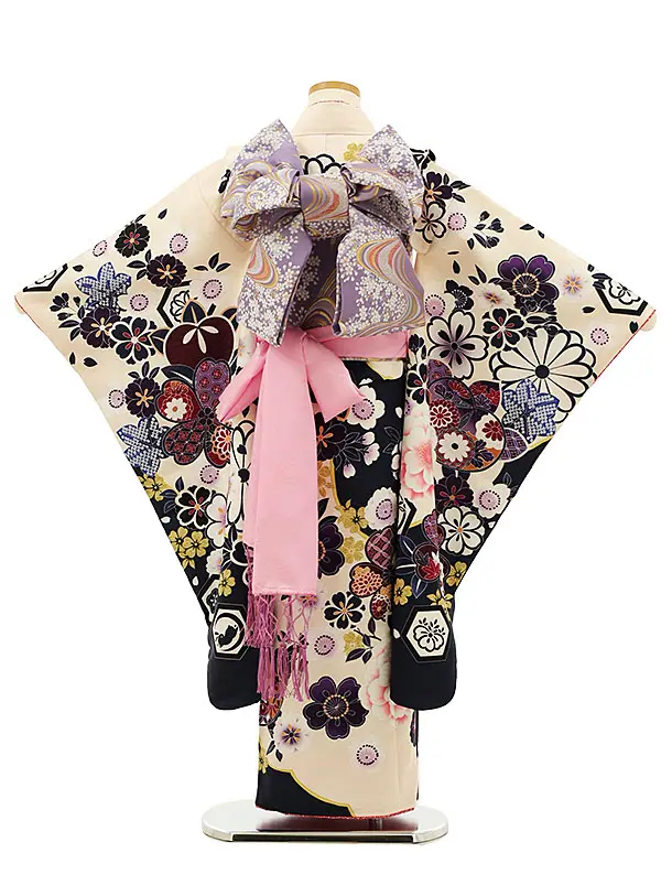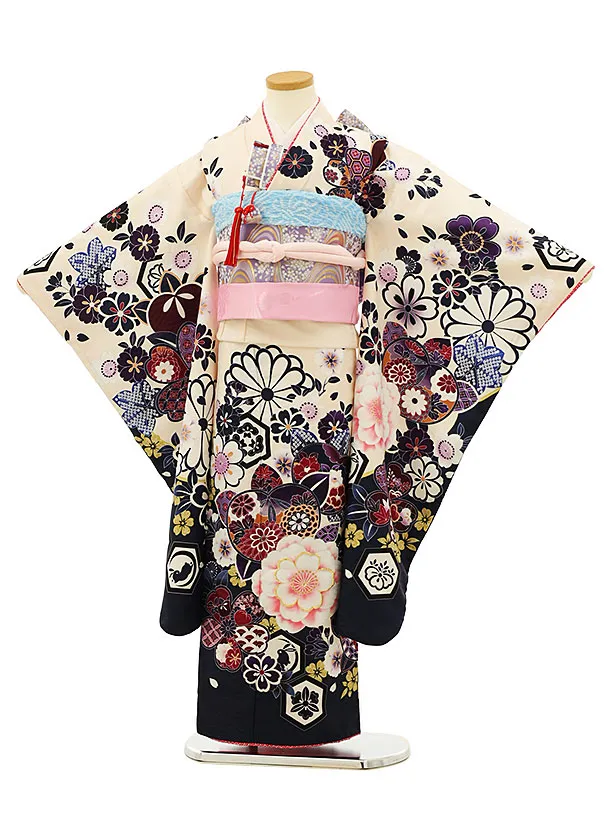七五三レンタル(7歳女の子結び帯)7988 アイボリー裾紺 牡丹橘菊